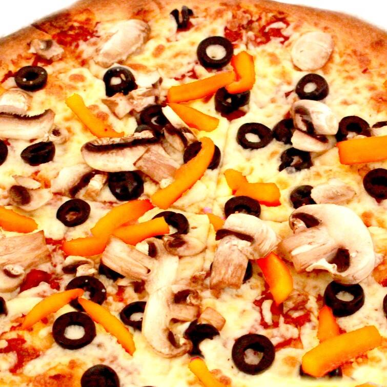 Preparada con aceituna negra, hongo y pimientos. Pizza artesanal, de masa delgadita, mediana, horneada en base de ladrillo refractario con ingredientes de alta calidad.