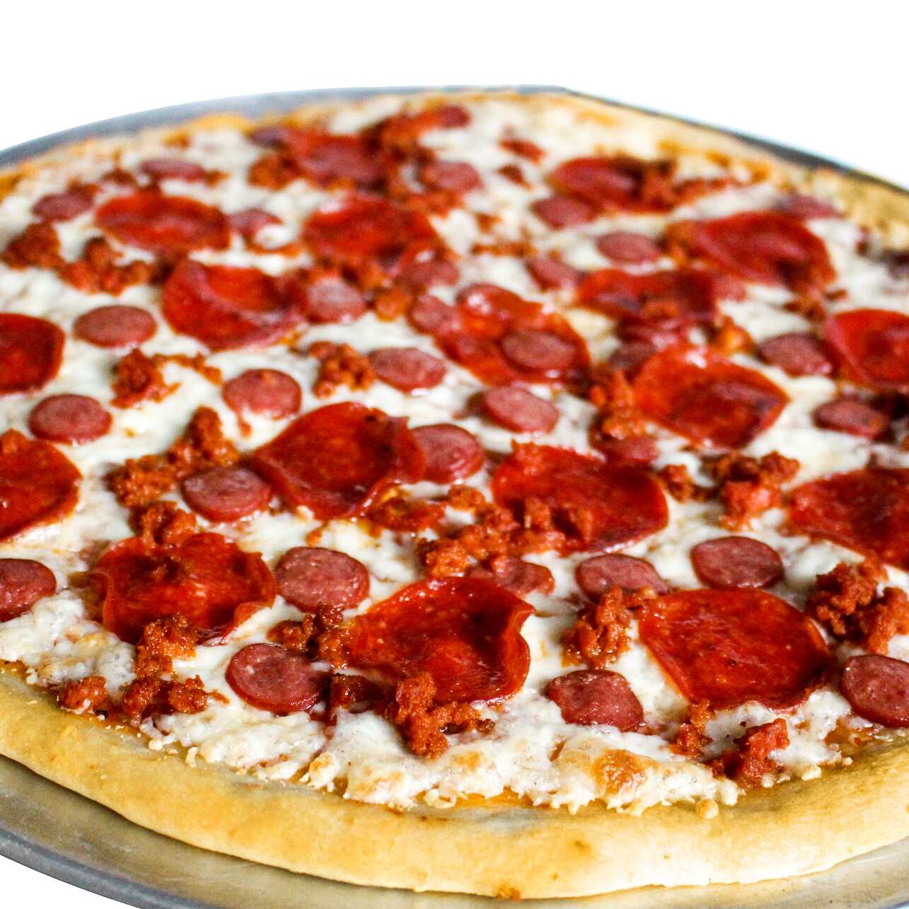 Preparada con salchicha de res, pepperoni y chorizo. Pizza artesanal, de masa delgadita, mediana, horneada en base de ladrillo refractario, con ingredientes de alta calidad.