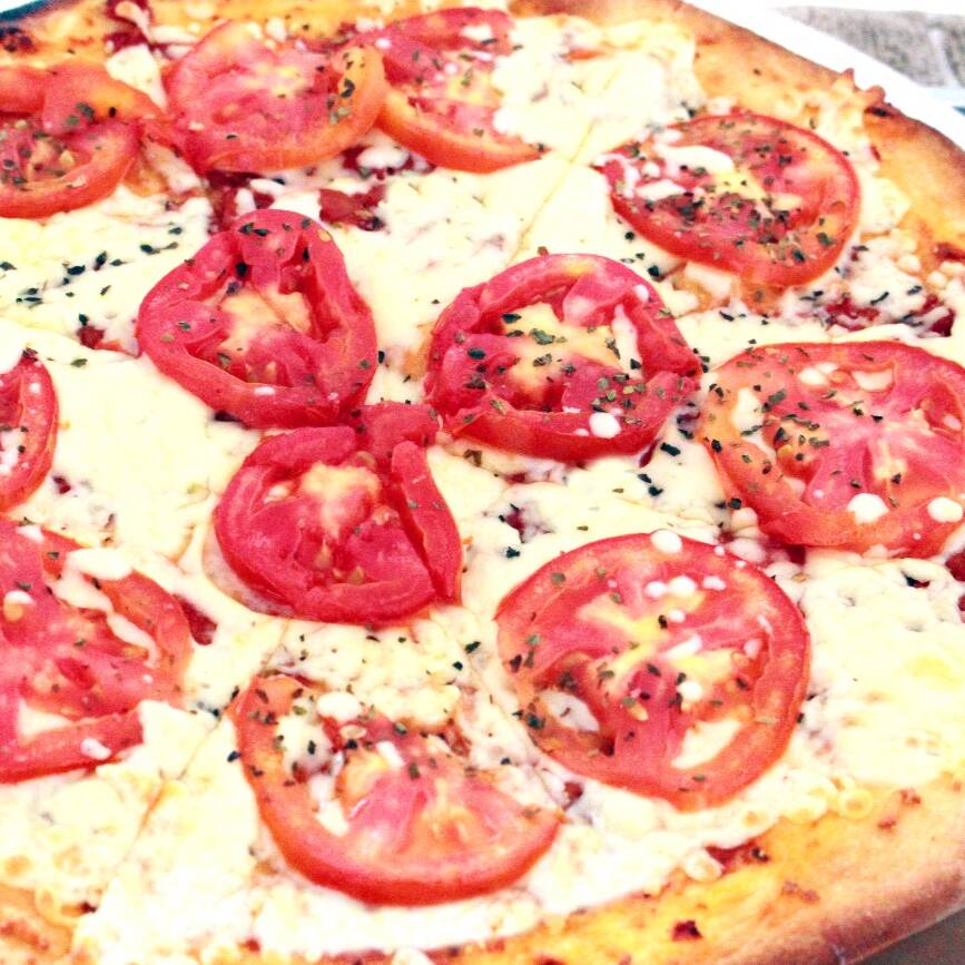 Preparada con jitomate y albahaca. Pizza artesanal, de masa delgadita, mediana, horneada en base de ladrillo refractario con ingredientes de alta calidad.
