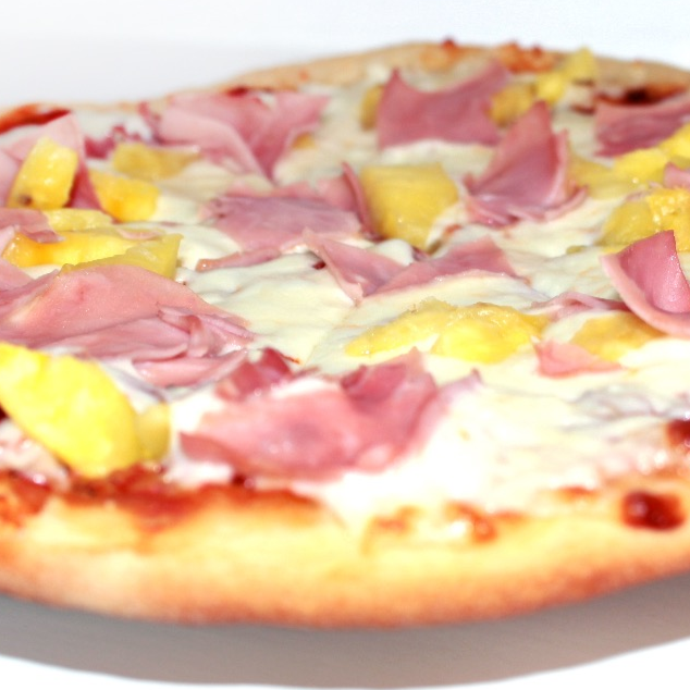 Preparada con jamón y piña natural. Pizza artesanal, de masa delgadita, mediana, horneada en base de ladrillo refractario con ingredientes de alta calidad.