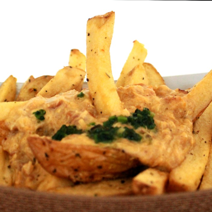 Papas en salsa cheddar con pollo y pesto.