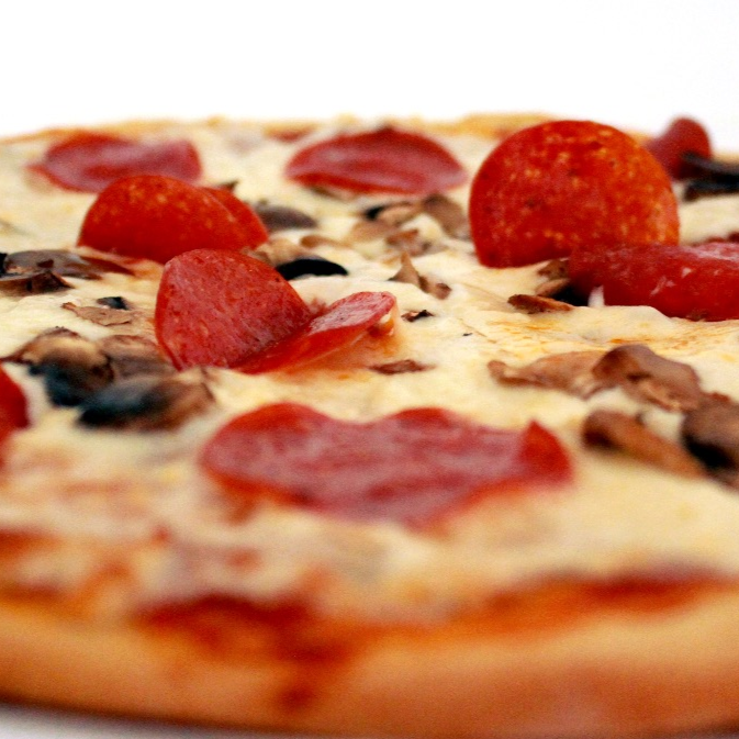 Pizza de pepperoni con champiñones pizza artesanal, de masa delgadita, mediana, horneada en base de ladrillo refractario con ingredientes de alta calidad.