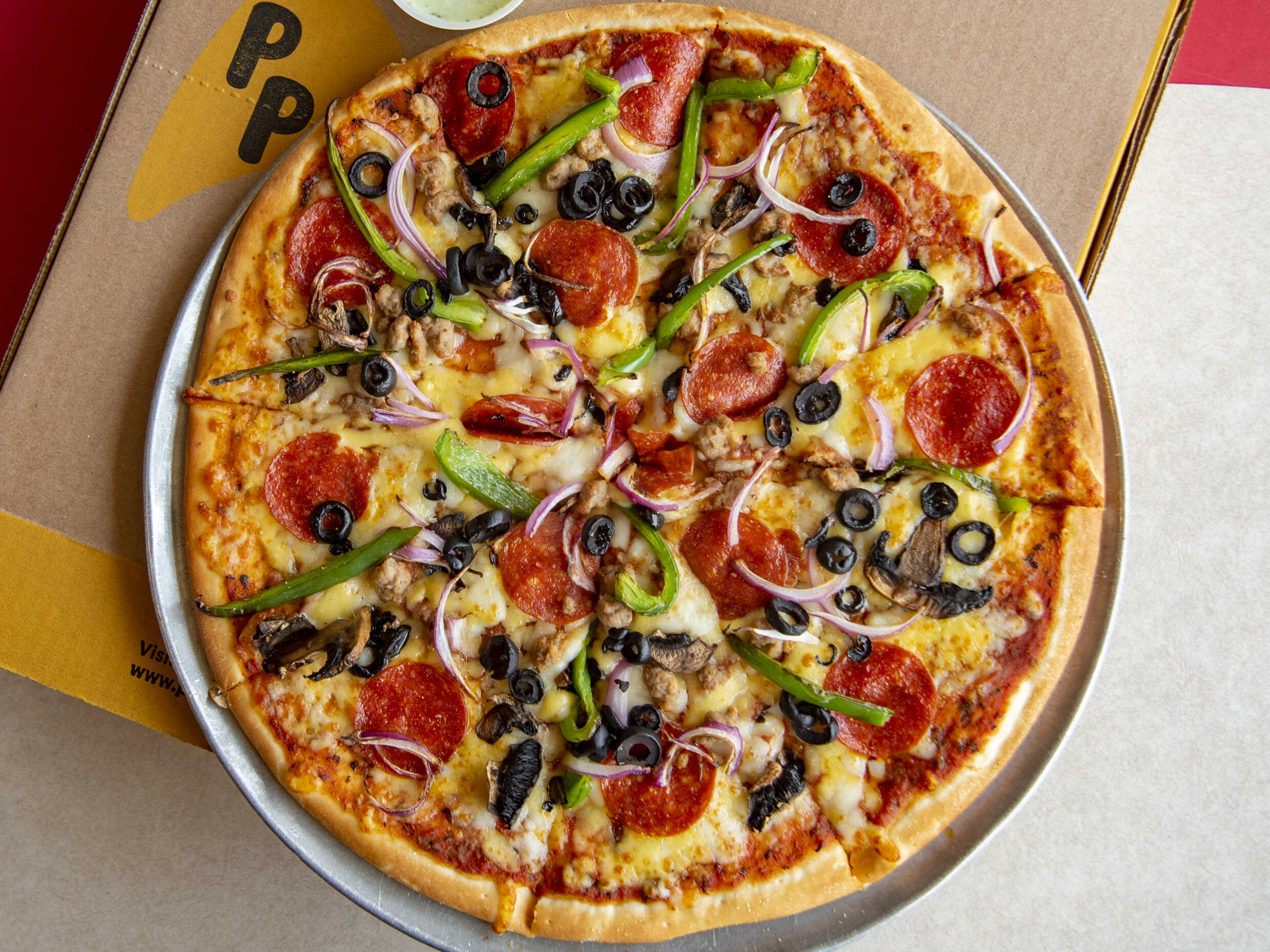Un viaje lleno de sabores con nuestra pizza Especial: una mezcla de pepperoni, salchicha italiana, pimiento verde, cebolla morada, champiñones y queso Navarro derretido a la perfección.