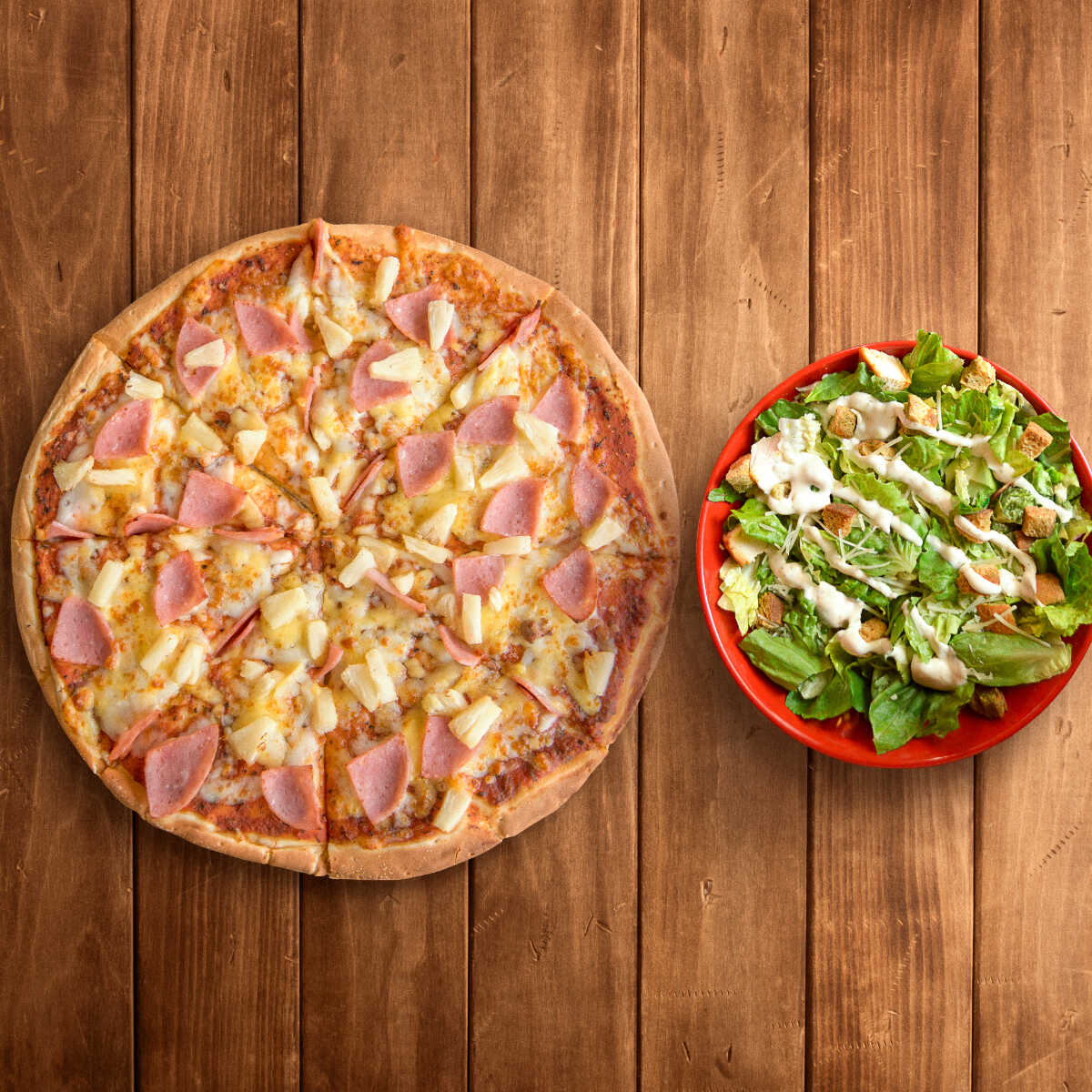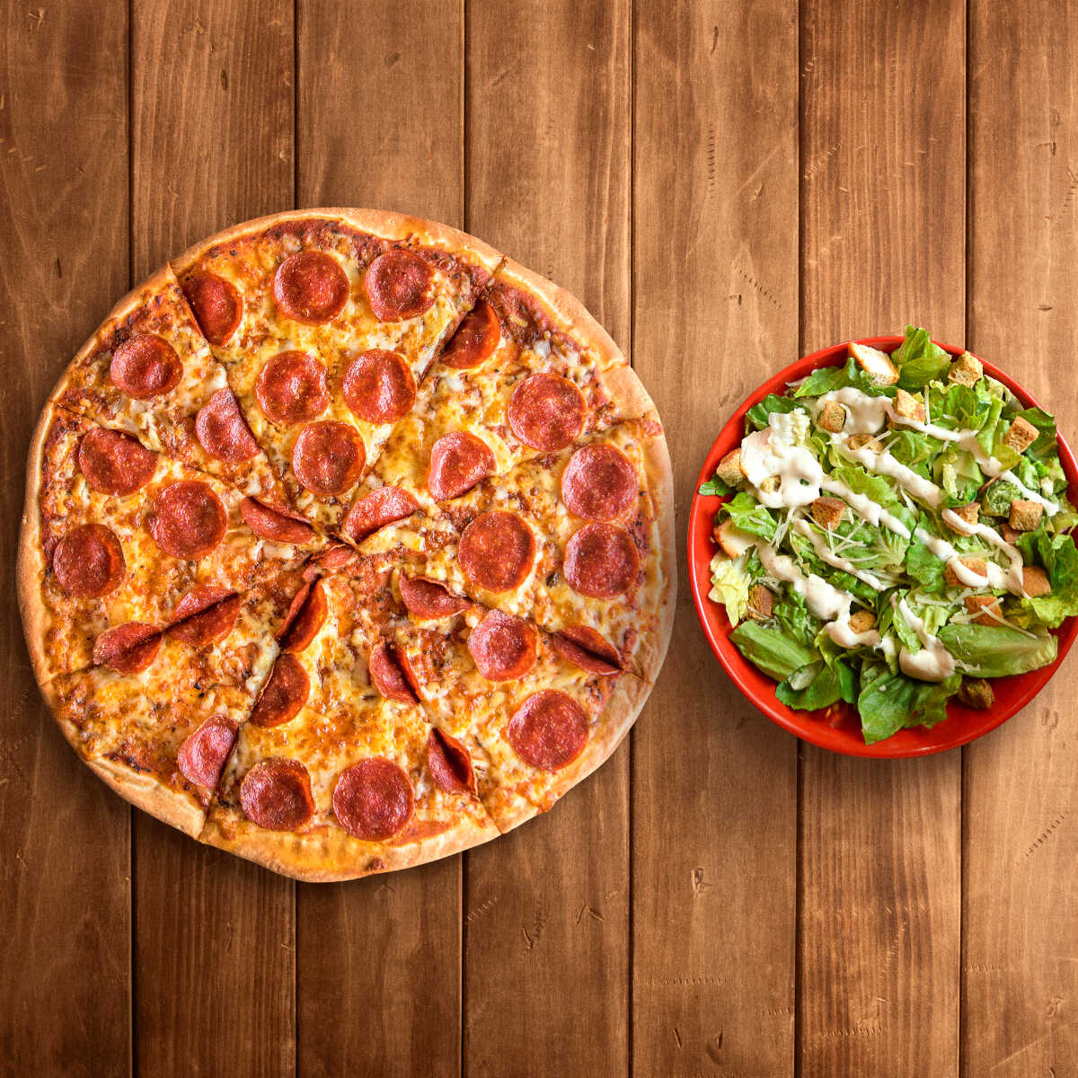 Pizza de pepperoni con una ensalada César (sin pollo)