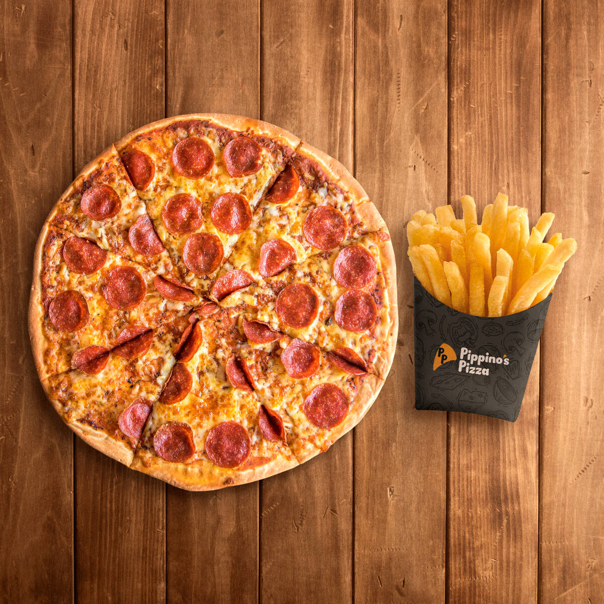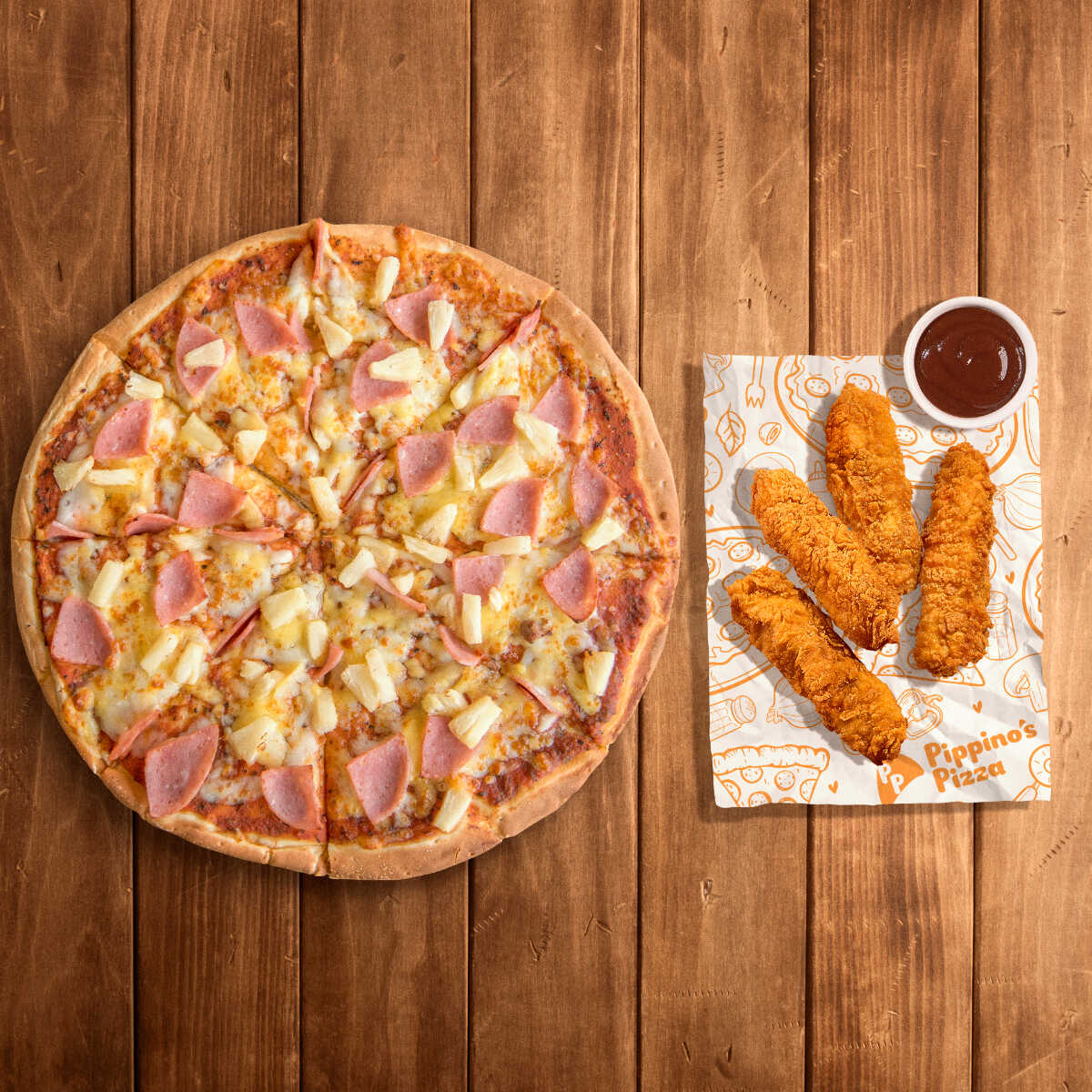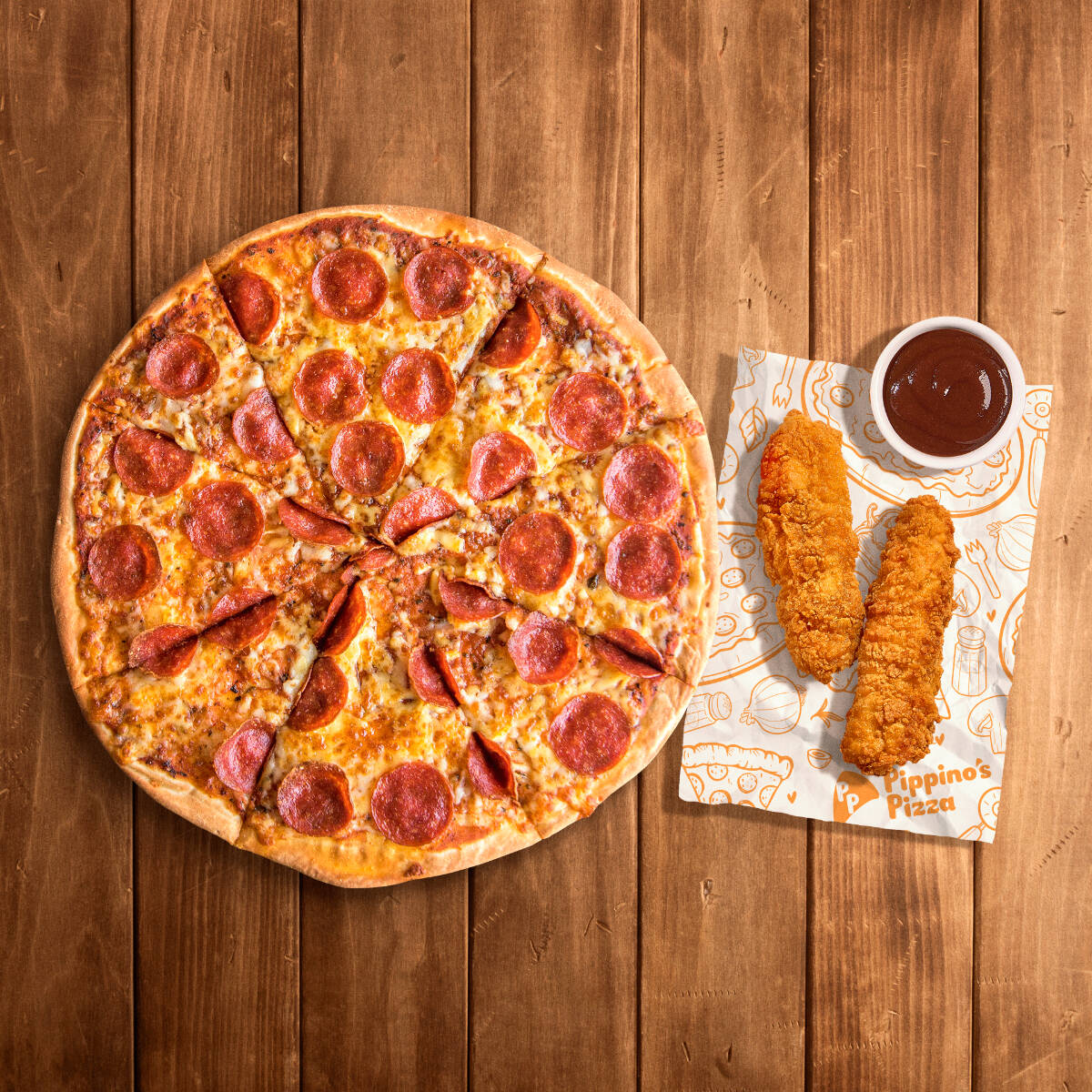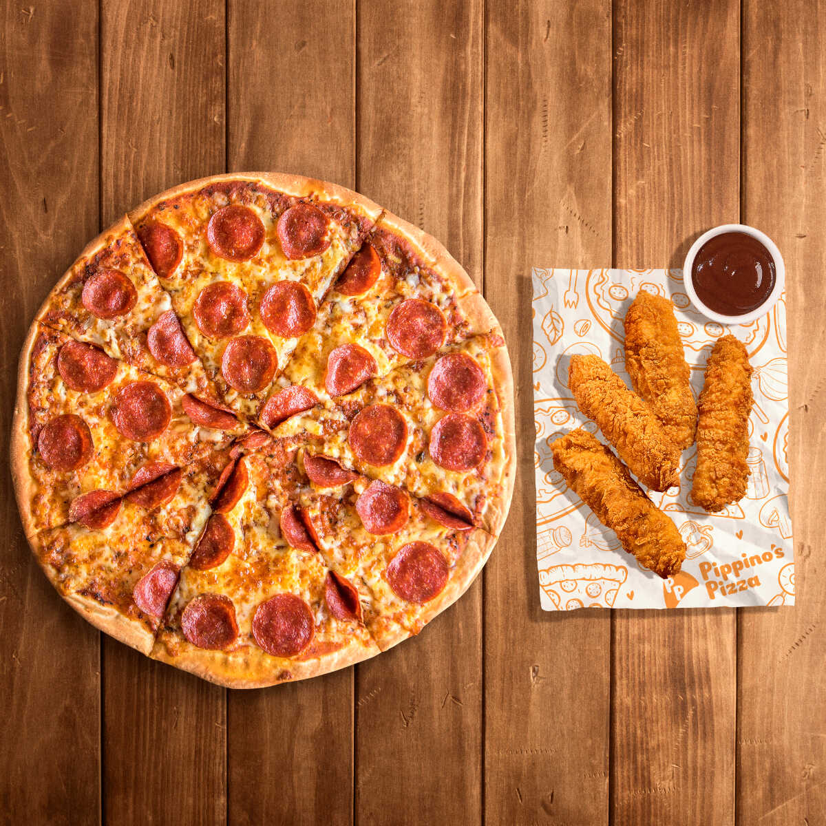Pizza de pepperoni con 4 tenders de pollo, acompañados con un dip.