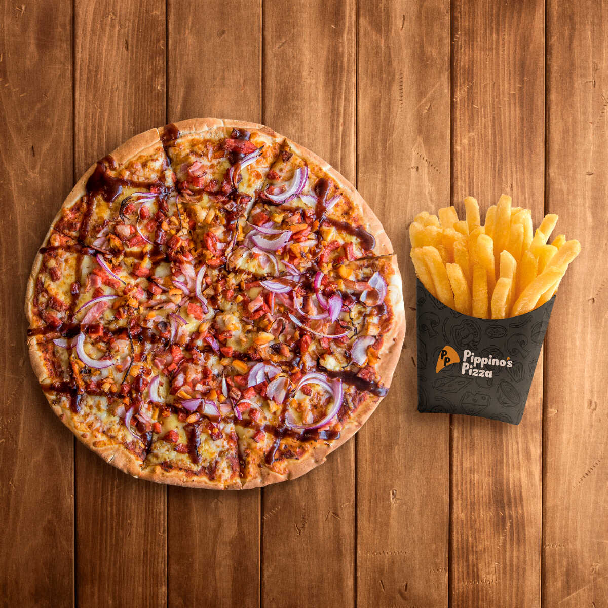 Lo mejor de nuestra parrilla en cada rebanada: pechuga de Pollo Pepe asadita, chorizo, trocitos de tocino, cebolla morada, cubierta de queso Navarro y salsa BBQ.