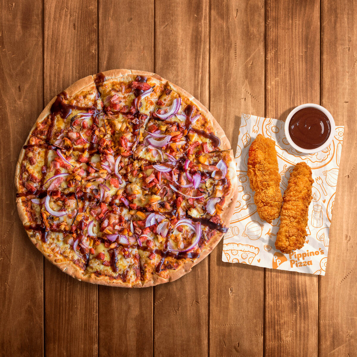 Pizza de especialidad con 4 tenders de pollo, acompañados con un dip.