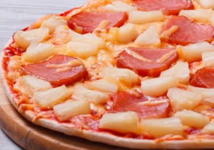 8 Rebanadas preparada con queso 230 gramos, jamón 60 gramos y piña 90 gramos.
