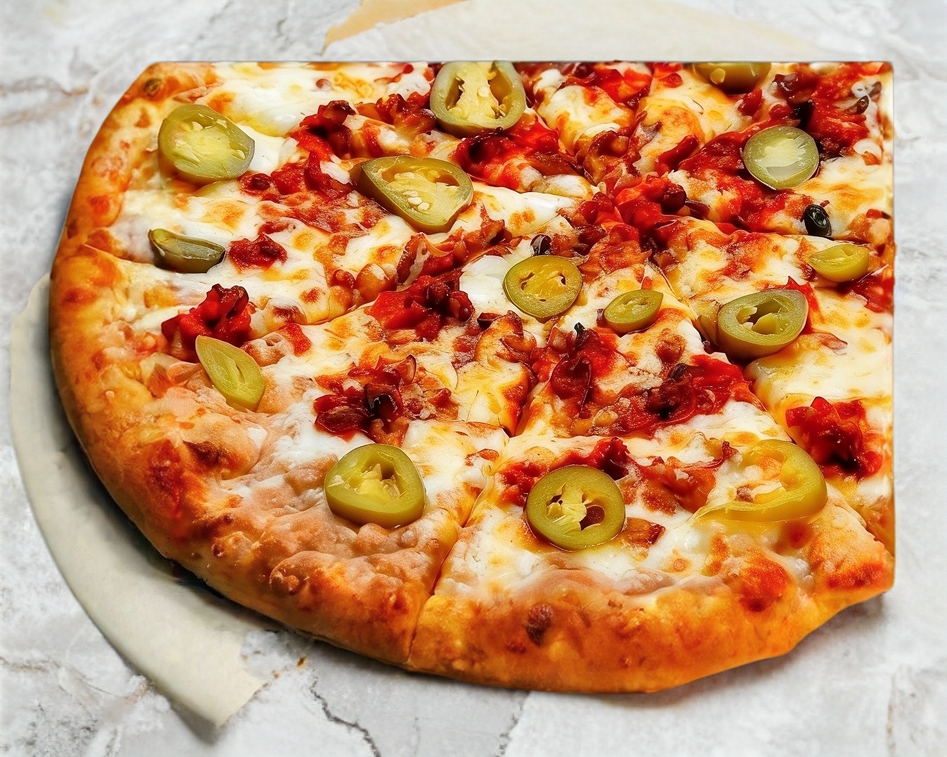 8 Rebanadas preparada con queso 230 gramos, jamón 60 gramos, chorizo 90 gramos, jalapeños 70 gramos y cebolla 40 gramos.