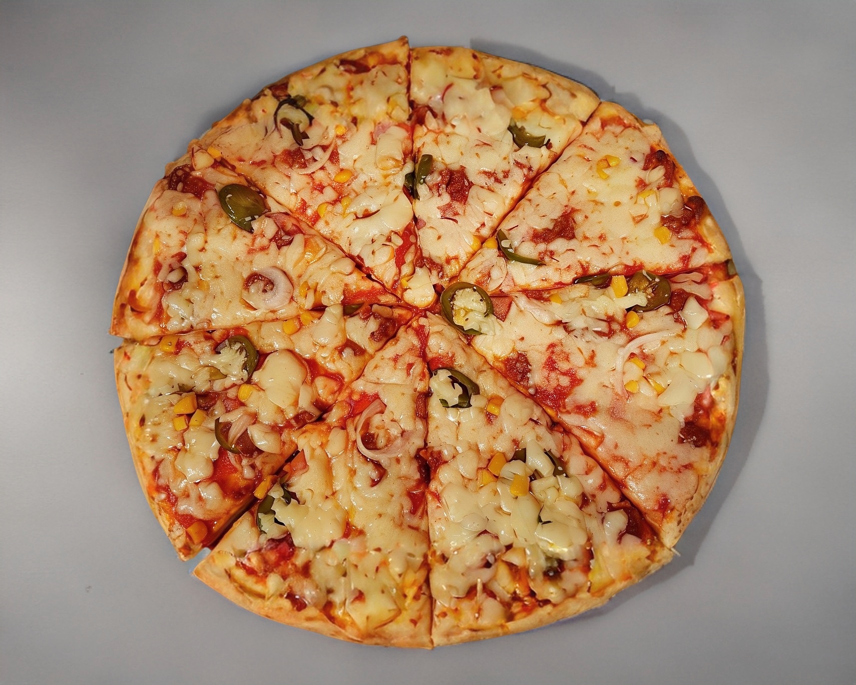 Tocino, chorizo, jalapeño, cebolla, elote y queso.