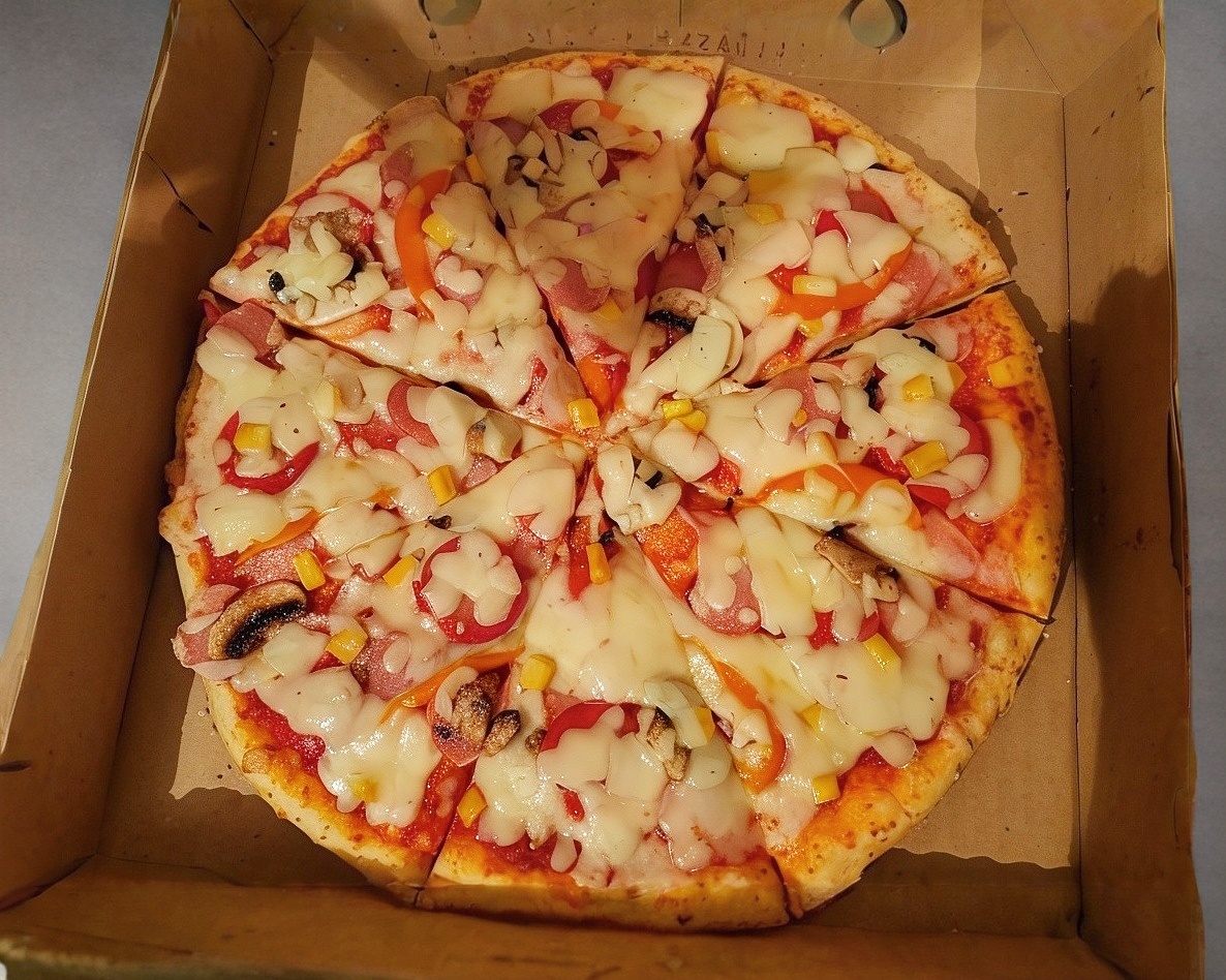 Jamón, salchicha, salchichón, pimiento, champiñones, elote y queso.