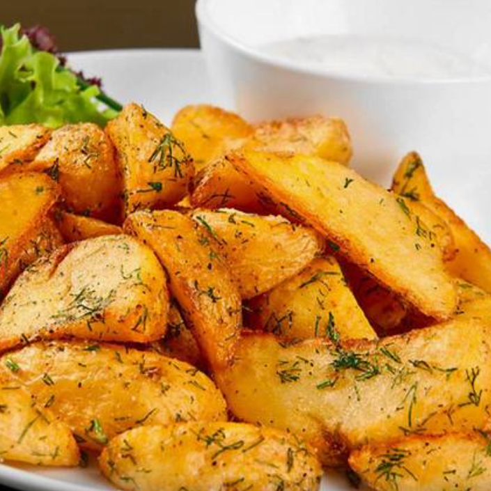 Porción 250 g de papas gajo con aderezo ranch.