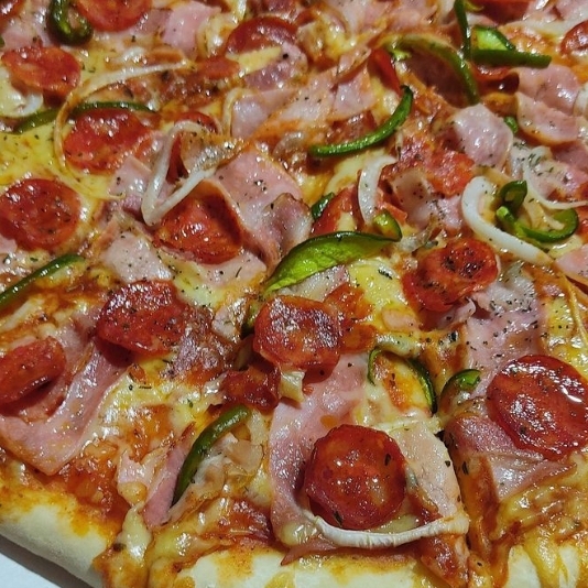 Pizza grande con jalapeño, chorizo, cebolla y queso mozzarella.