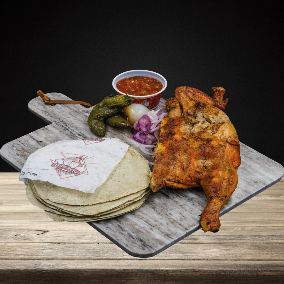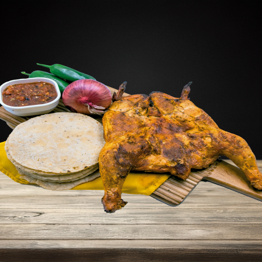 Medio pollo asado grande, incluye 1 salsa tradicional (1/2 pollo:1 bote), chiles y cebolla, 1 paquete de tortillas (10 pzas).