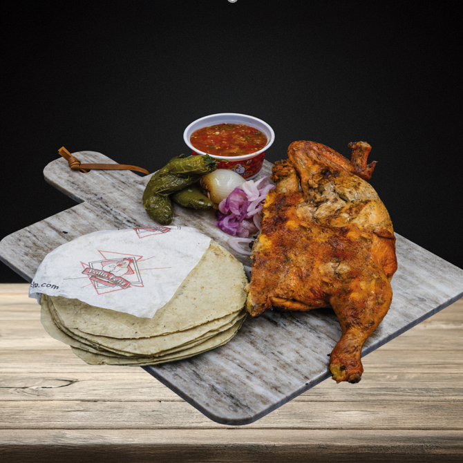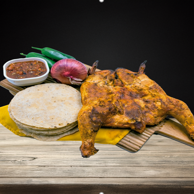 Medio pollo asado grande, incluye 1 salsa tradicional, chiles y cebolla, 1 paquete de tortillas (10 pzas). Guía de salsa: 1/2 pollo: 1 bote.