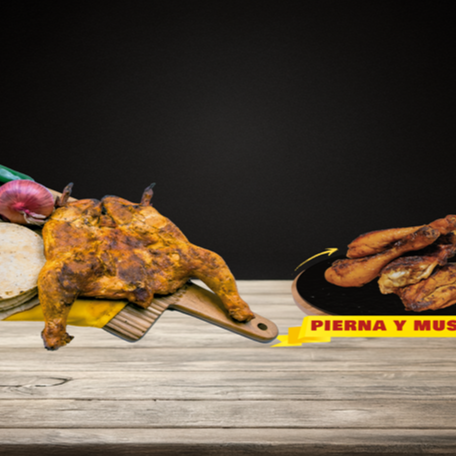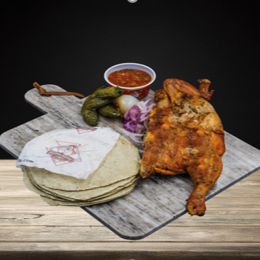 Medio pollo asado chico. Incluye 1 salsa tradicional, chiles y cebolla, 1 paquete de tortillas (6 pzas).