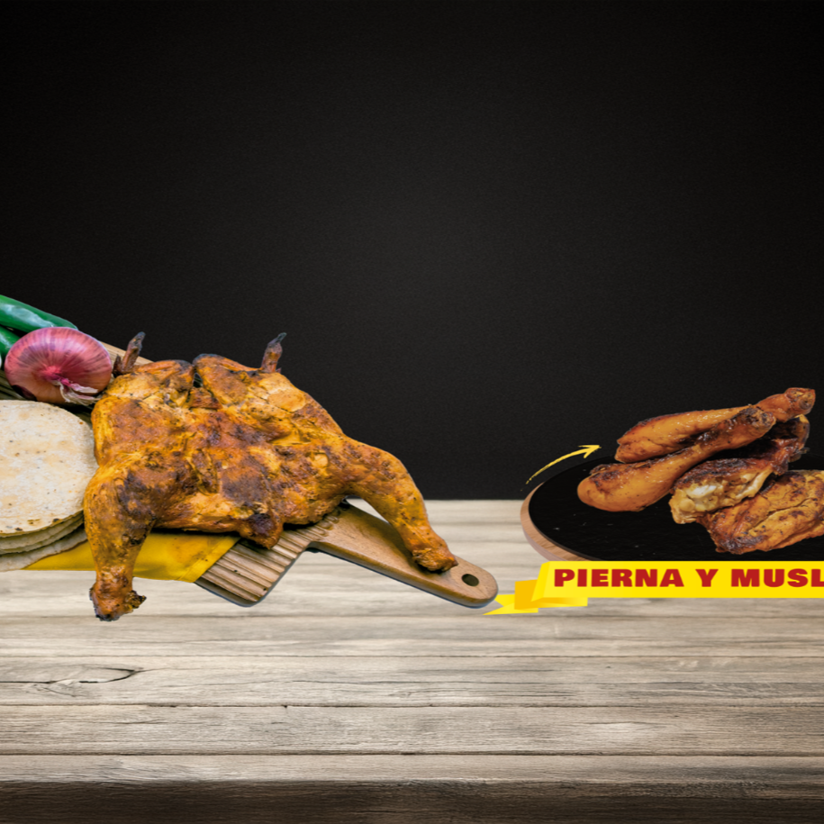 Medio pollo asado chico, incluye 1 salsa tradicional (1 bote), chiles y cebolla, 1 paquete de tortillas (6 pzas).