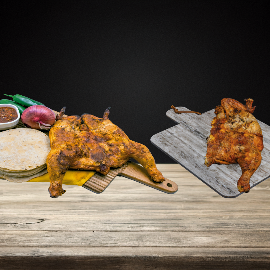 Medio pollo asado mediano, Incluye 1 salsa tradicional, chiles y cebolla, 1 paquete de tortillas (6 pzas)