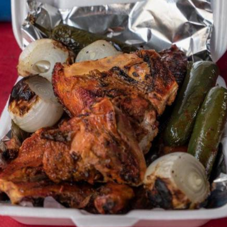 4 pzas De pollo asado acompañado de arroz, tortillas, salsa verde, salsa roja, cebollitas asadas y chiles jalapeños.