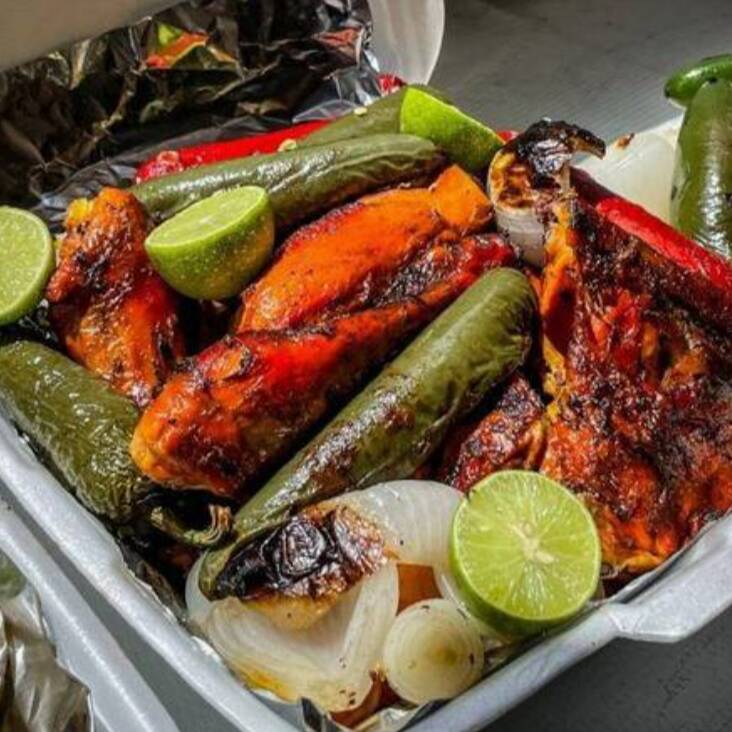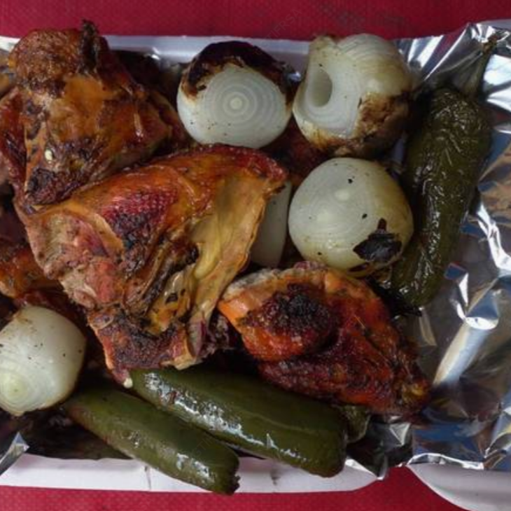8 pzas De pollo asado acompañado de arroz, tortillas, salsa verde, salsa roja, cebollitas asadas y chiles jalapeños.
