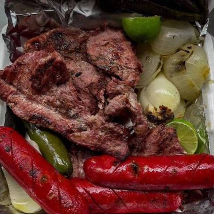 1/2 kg Carne asada, 1/2 kg arrachera, 1/2 kg costilla, 7 salchichones.