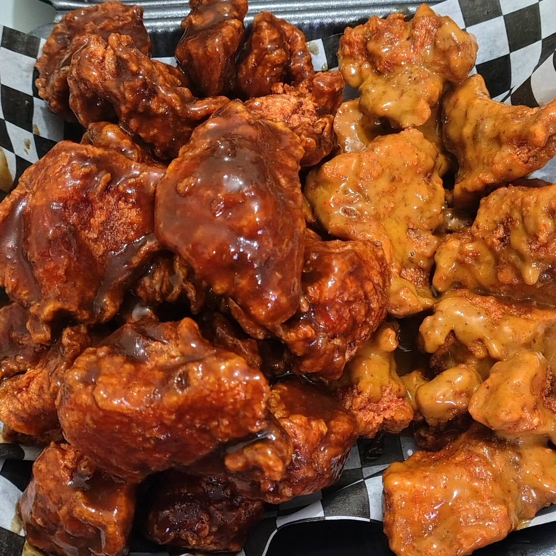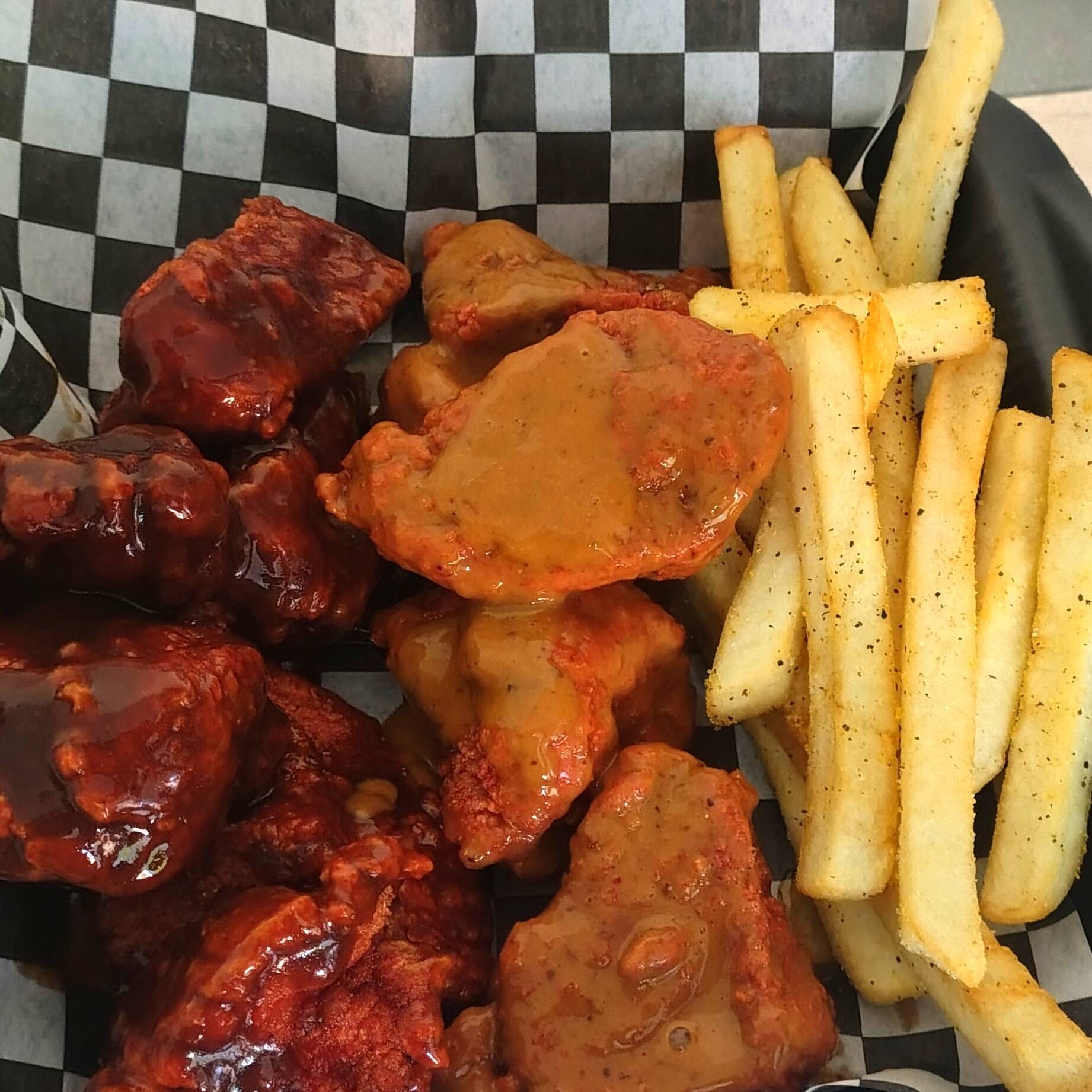 30 boneless bañados en 3 salsas a tu elección + porción de papas a la francesa + aderezo ranch 2oz
