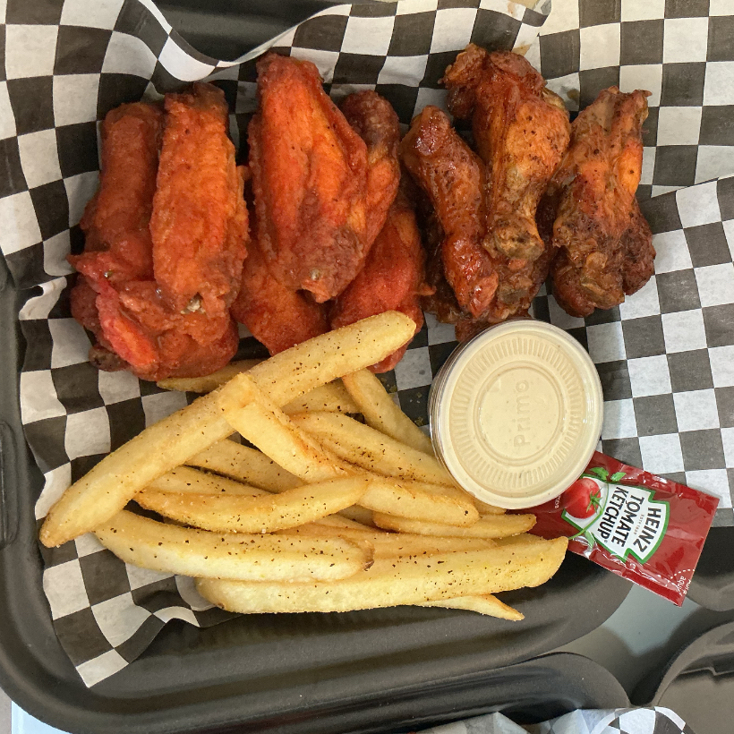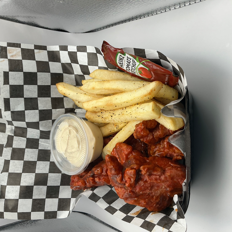 5 alitas bañadas en 1 salsa de tu elección + porción de papas a la francesa + 1oz de aderezo ranch