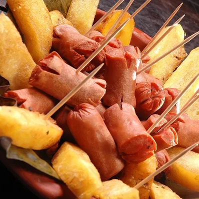 Trocitos de salchicha con 240g de papas a la francesa; incluye catsup, salsa Valentina y queso amarillo.