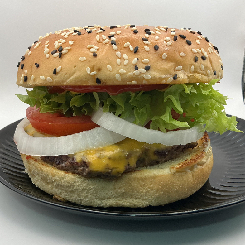 Hamburguesa grande, carne cuarto de libra casera 80/20, queso americano real, tocino, pepinillos, chiles en vinagre, mayonesa, mostaza, catsup y vegetales