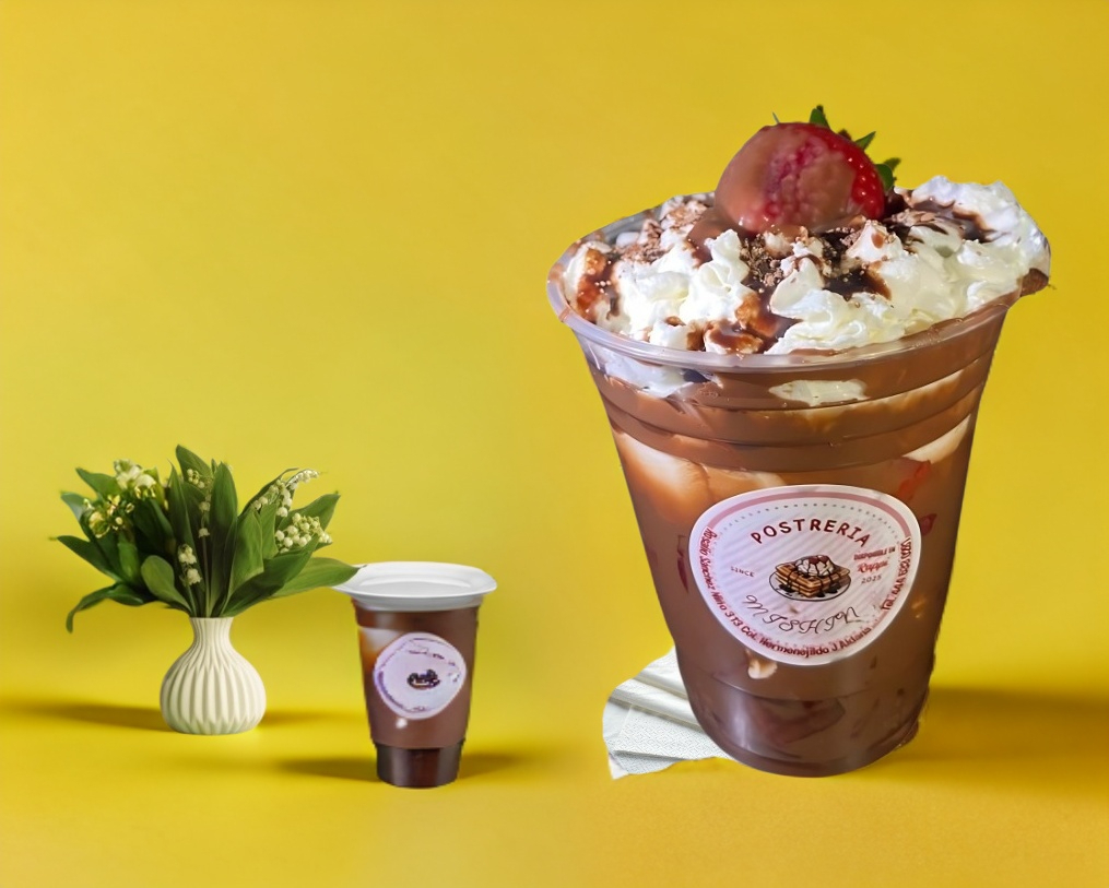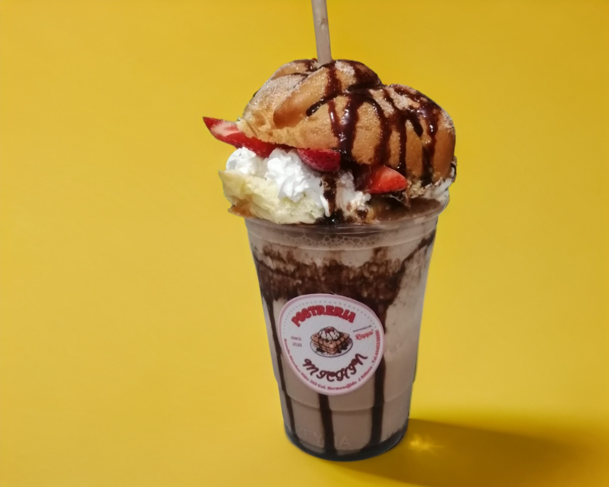 frappe de chocolate abuelita cubierto con un pan relleno de fresa con crema batida