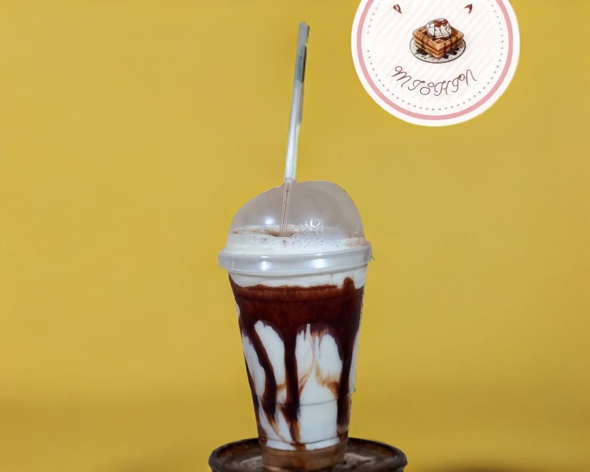Mezcla de cafés con leche hecho frappe decorado con crema batida y chispas de chocolate.