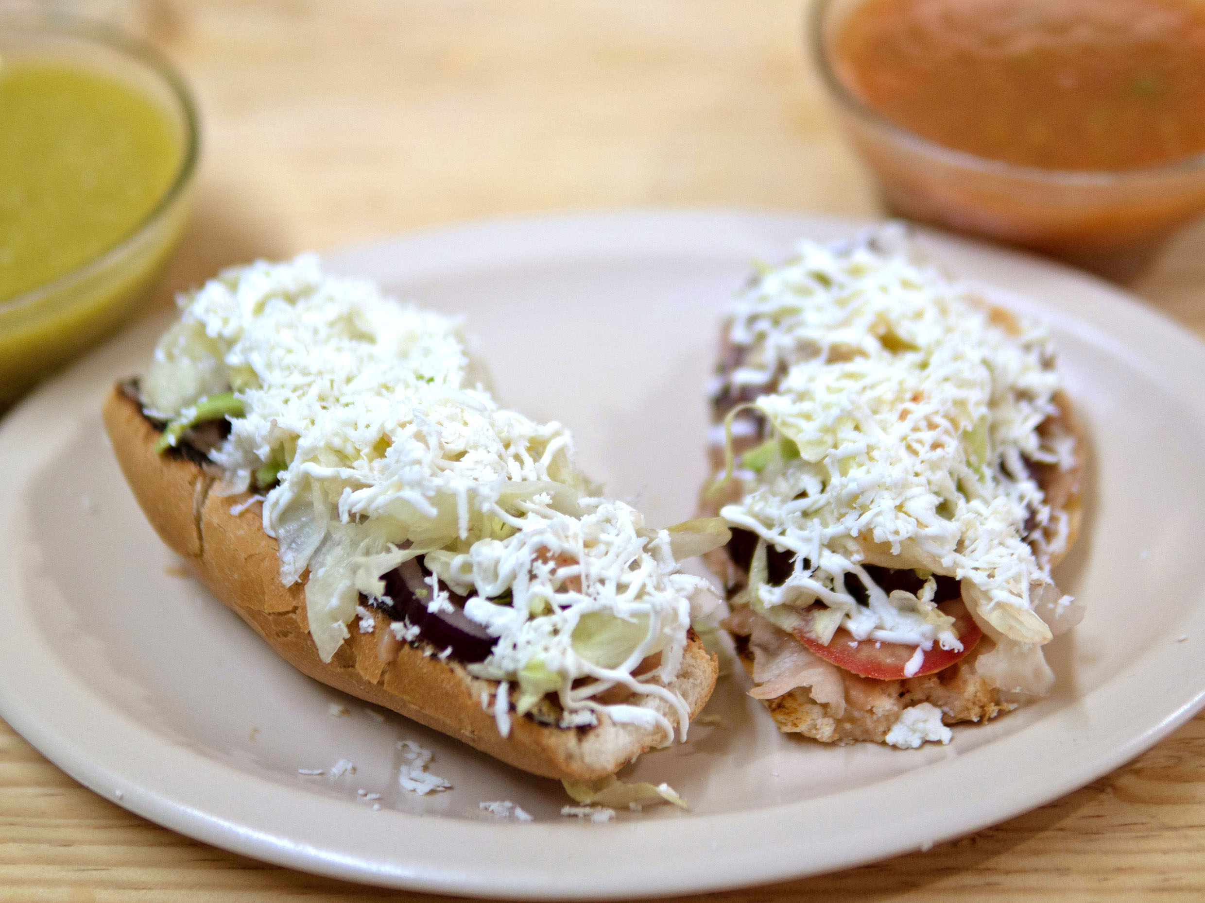 CRUJIENTE MITAD DE BOLILLO CALIENTITO, ACOMPAÑADO DE FRIJOLES, QUESO FRESCO, LECHUGA, CEBOLLA, TOMATE, CREMA