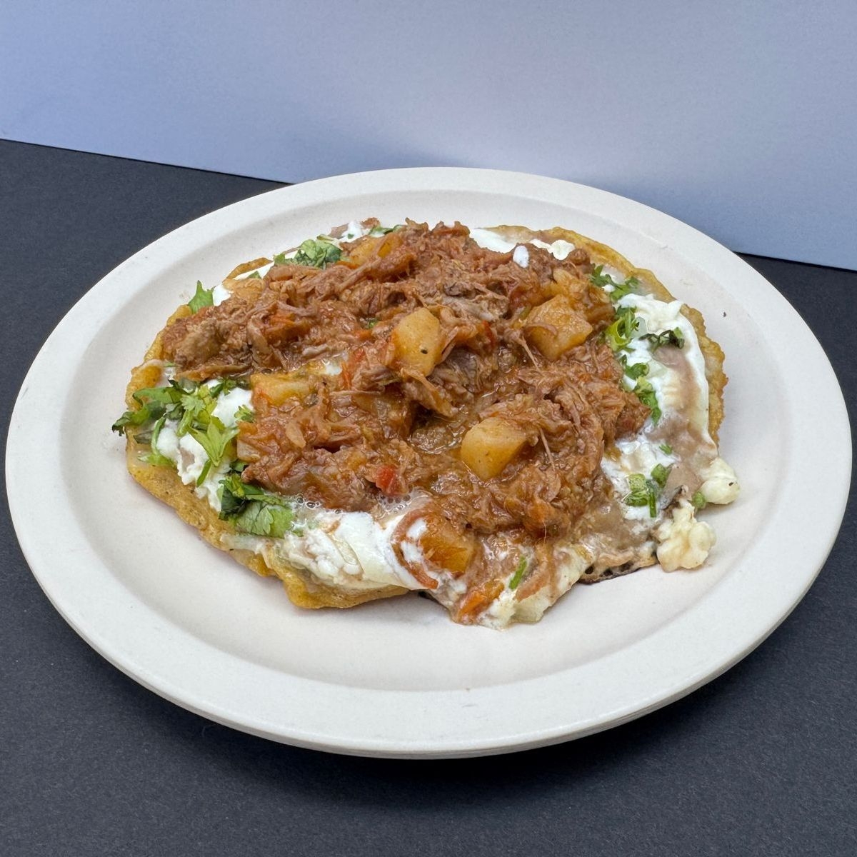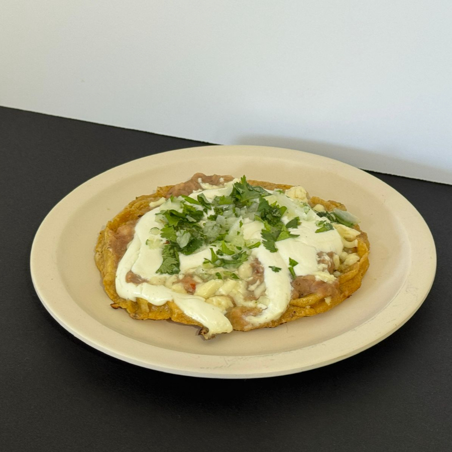 Masa nixtamalizada, con base de frijolitos refritos, queso fresco, crema y cilantro y cebolla, doradito, con tu guisado preferido arriba