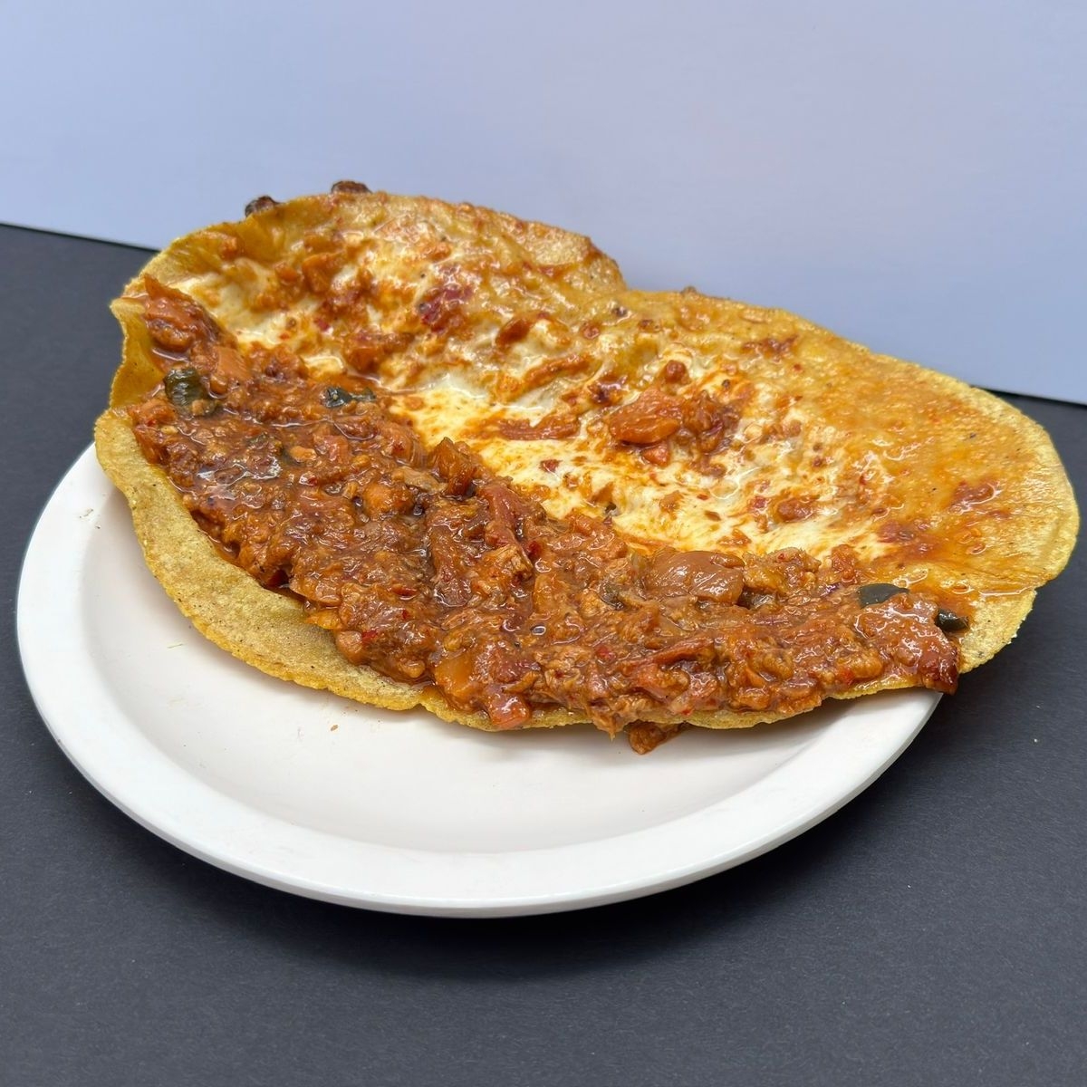 Masa nixtamalizada, rellena con queso oaxaca y tu guisado preferido, tostadita, de aprox. 18 cm de largo