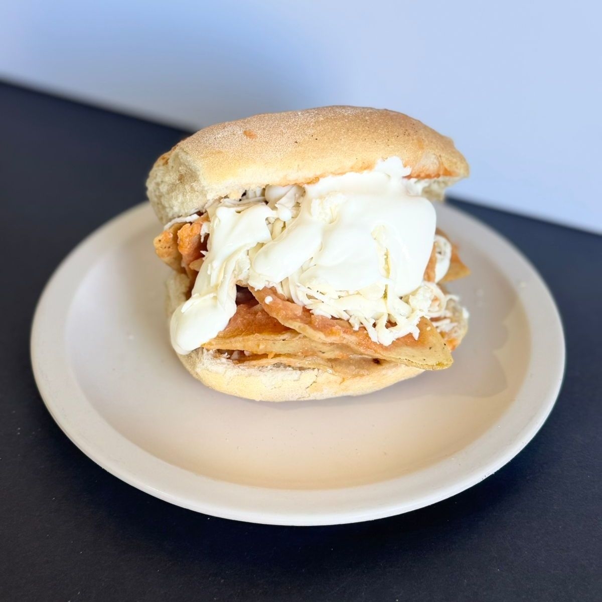 Bolillo relleno con nuestro totopo crujentito, en nuestra salsa roja picosita, queso fresco y crema, acompañado con chile toreado.