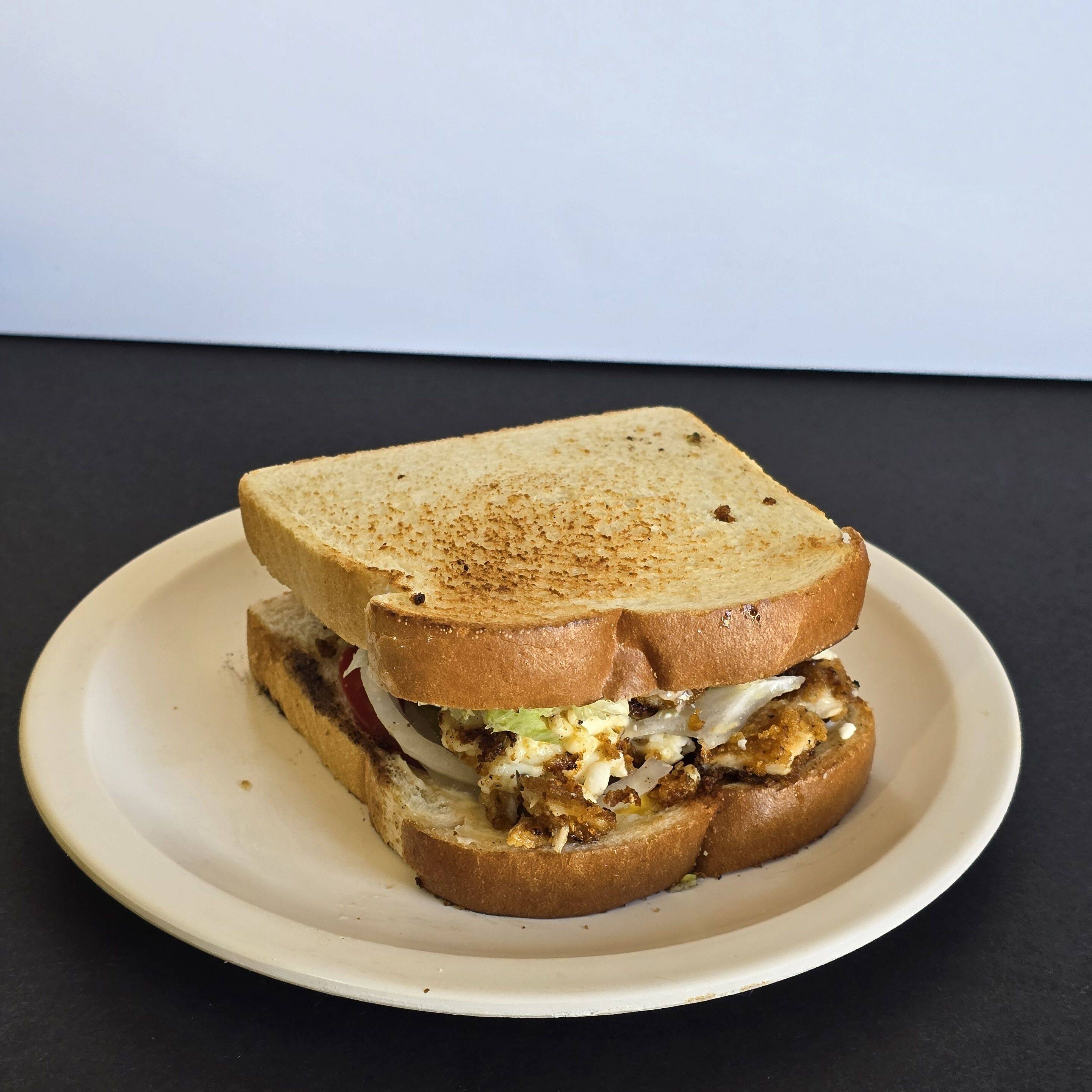 Pan de sándwich a dos niveles, tostado con mayonesa, mostaza, nuestra receta secreta de milanesa de pollo, queso fresco, lechuga, jitomate, cebolla y chiles, calentito.