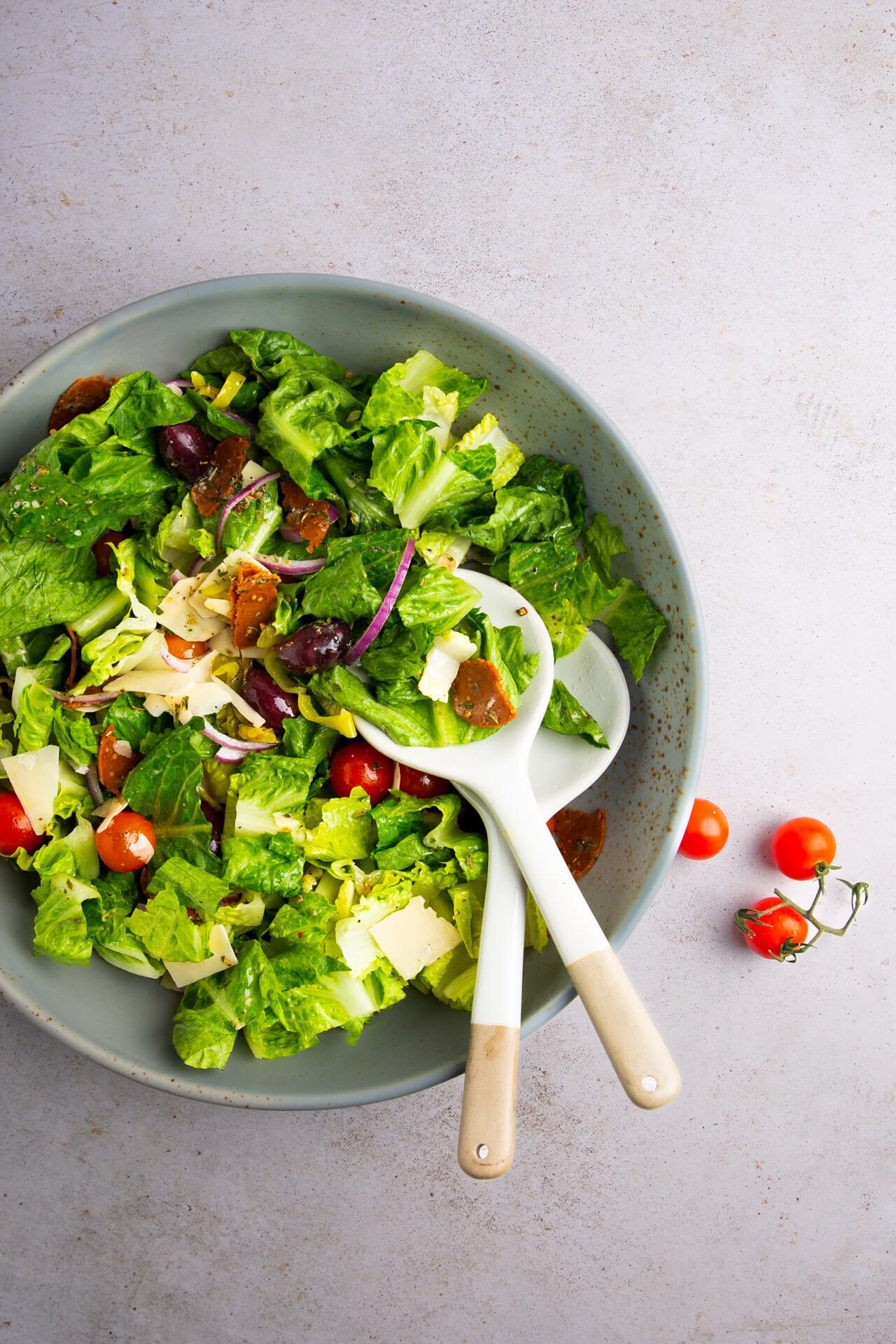 Lechuga dulce, tomate cherry, aceituna negra, queso mozzarella, aceite de oliva, orégano y cebolla.