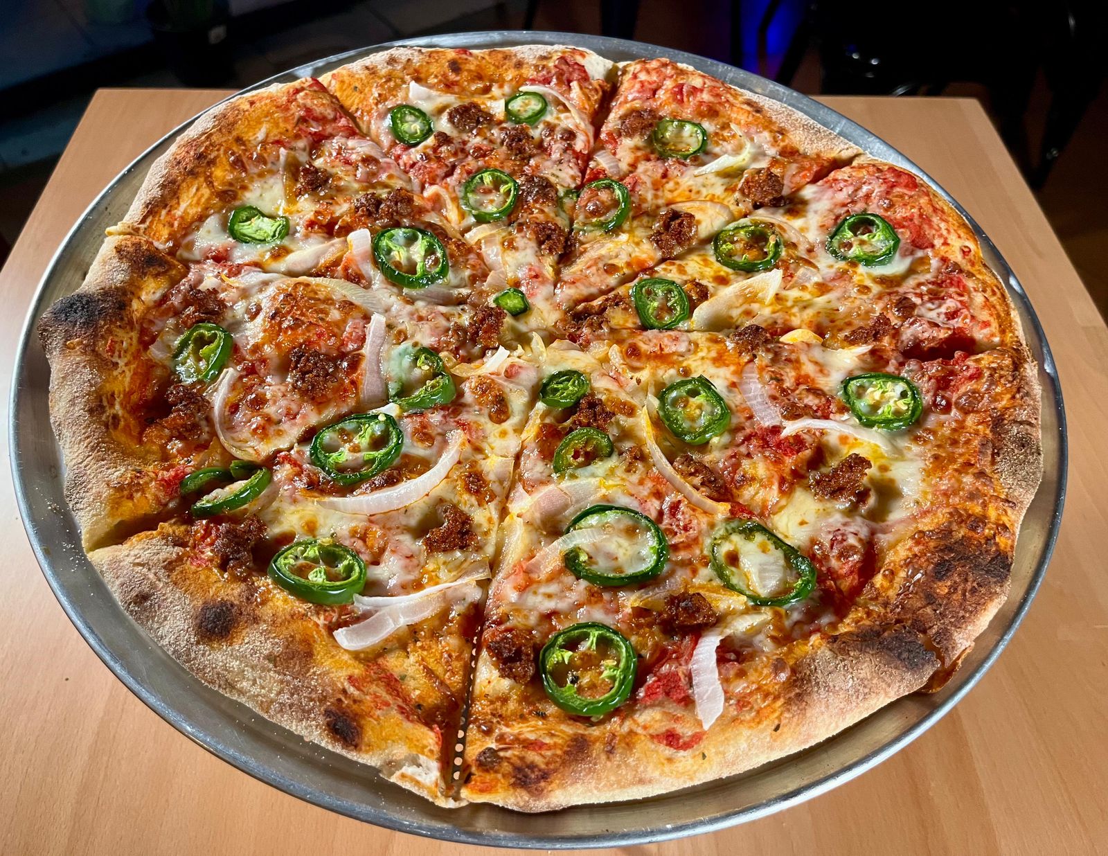 Mozzarella, aceitunas, champiñones, pimiento y cebolla.