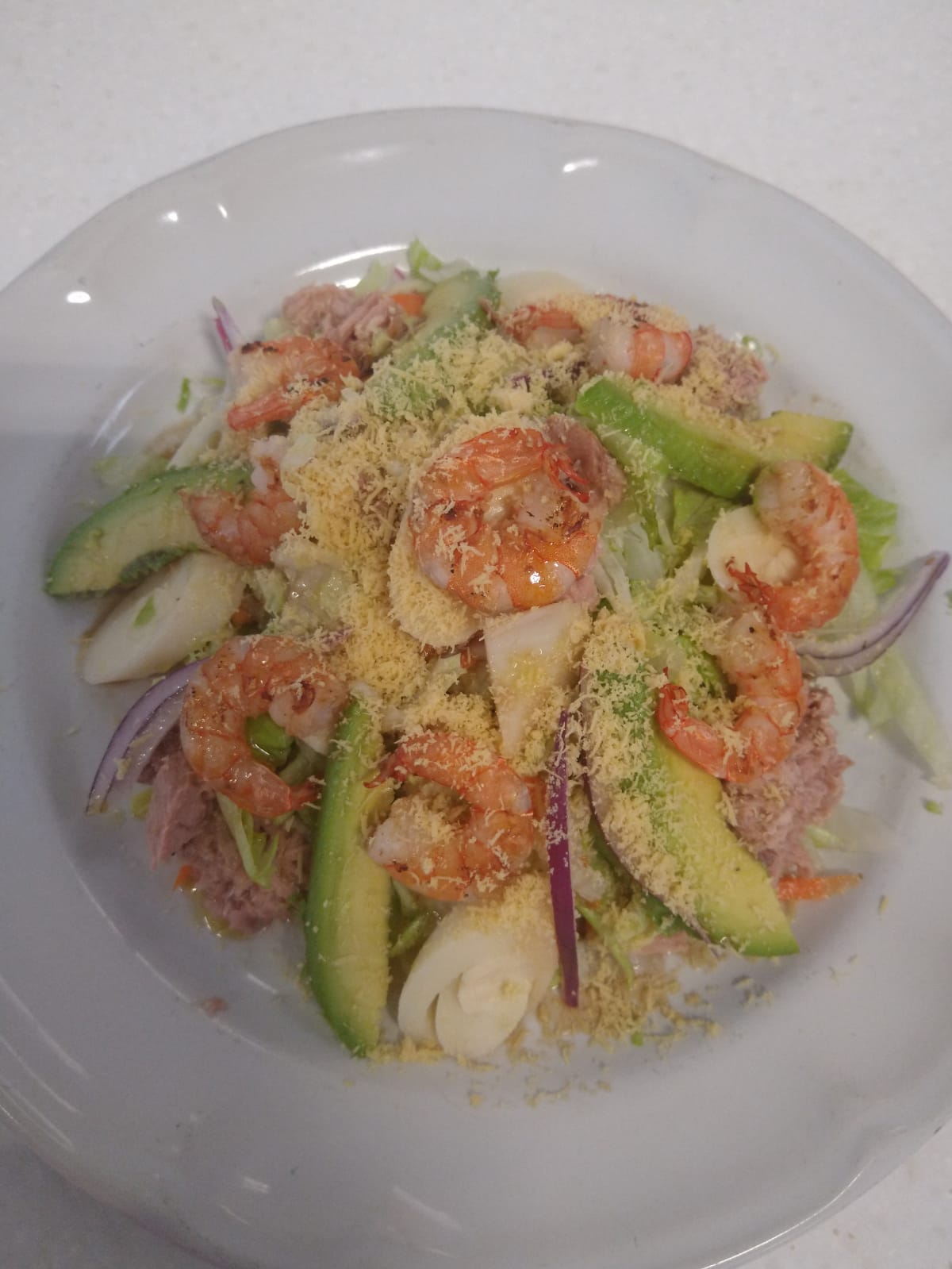 Lechugas mixtas, aros de cebolla, camarón de pacotilla, atún, palmito y aguacate.