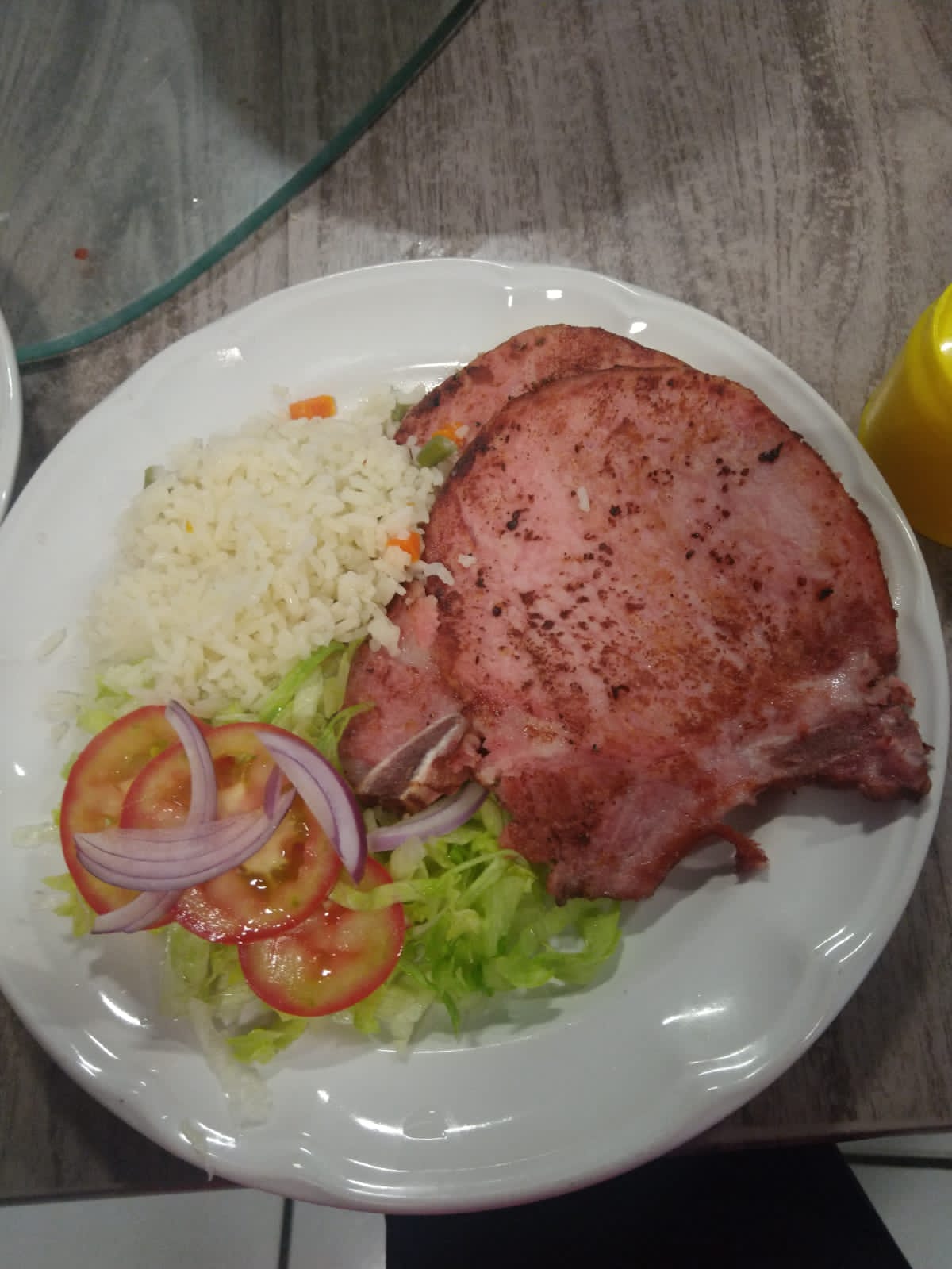 La chuleta ahumada va acompañada de arroz y ensalada de lechuga.