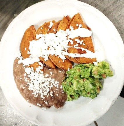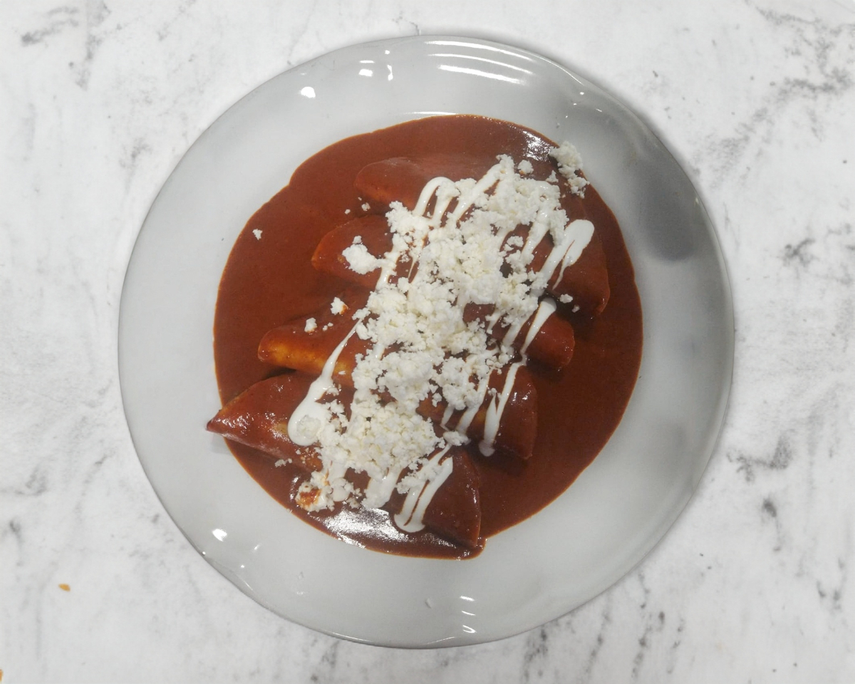 5 enchiladas que llevan crema, queso de chihuahua, guacamole y frijoles + bebida de 600ml a elección.