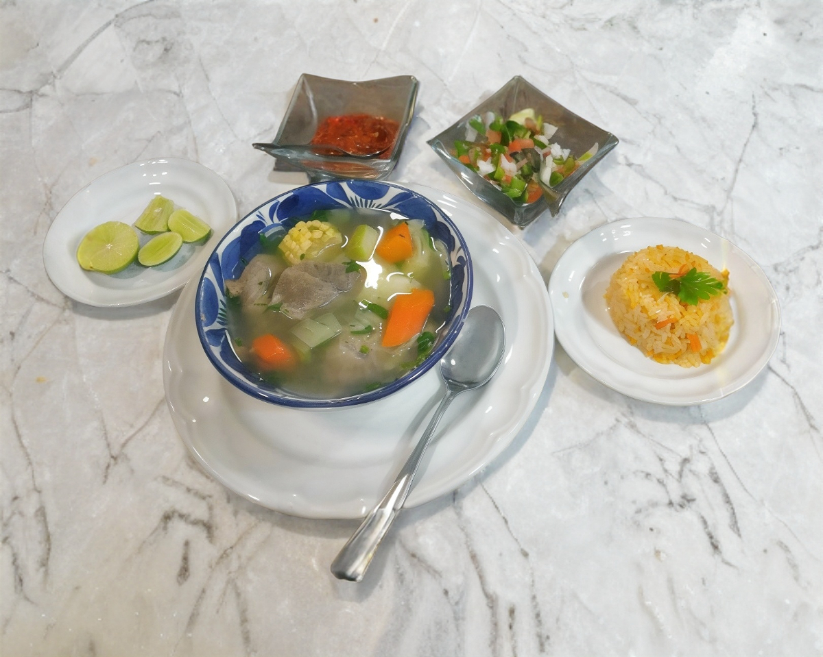 Preparado con ajo, chile guajillo, arroz, ensalada, limón además galletas y totopos.