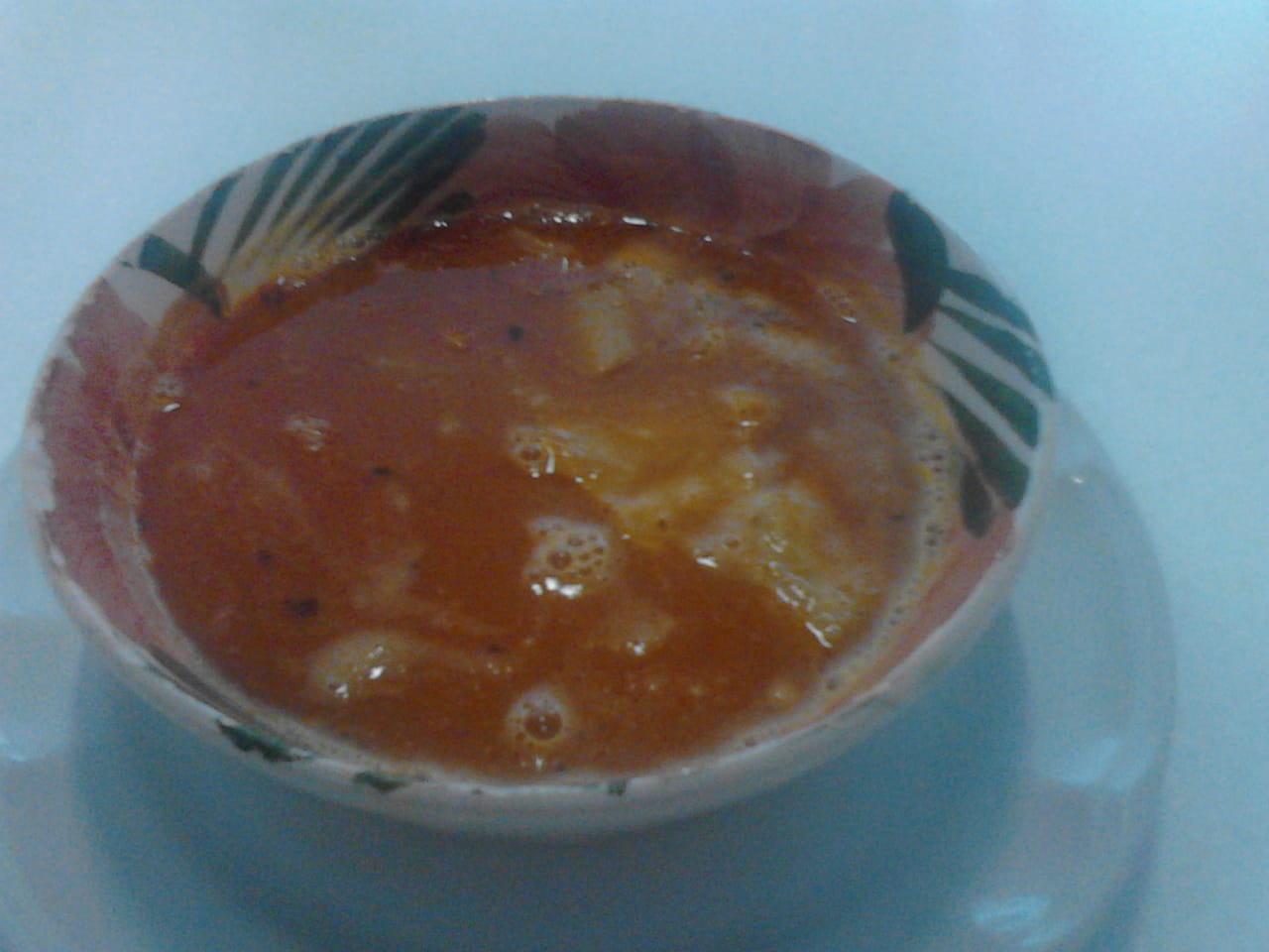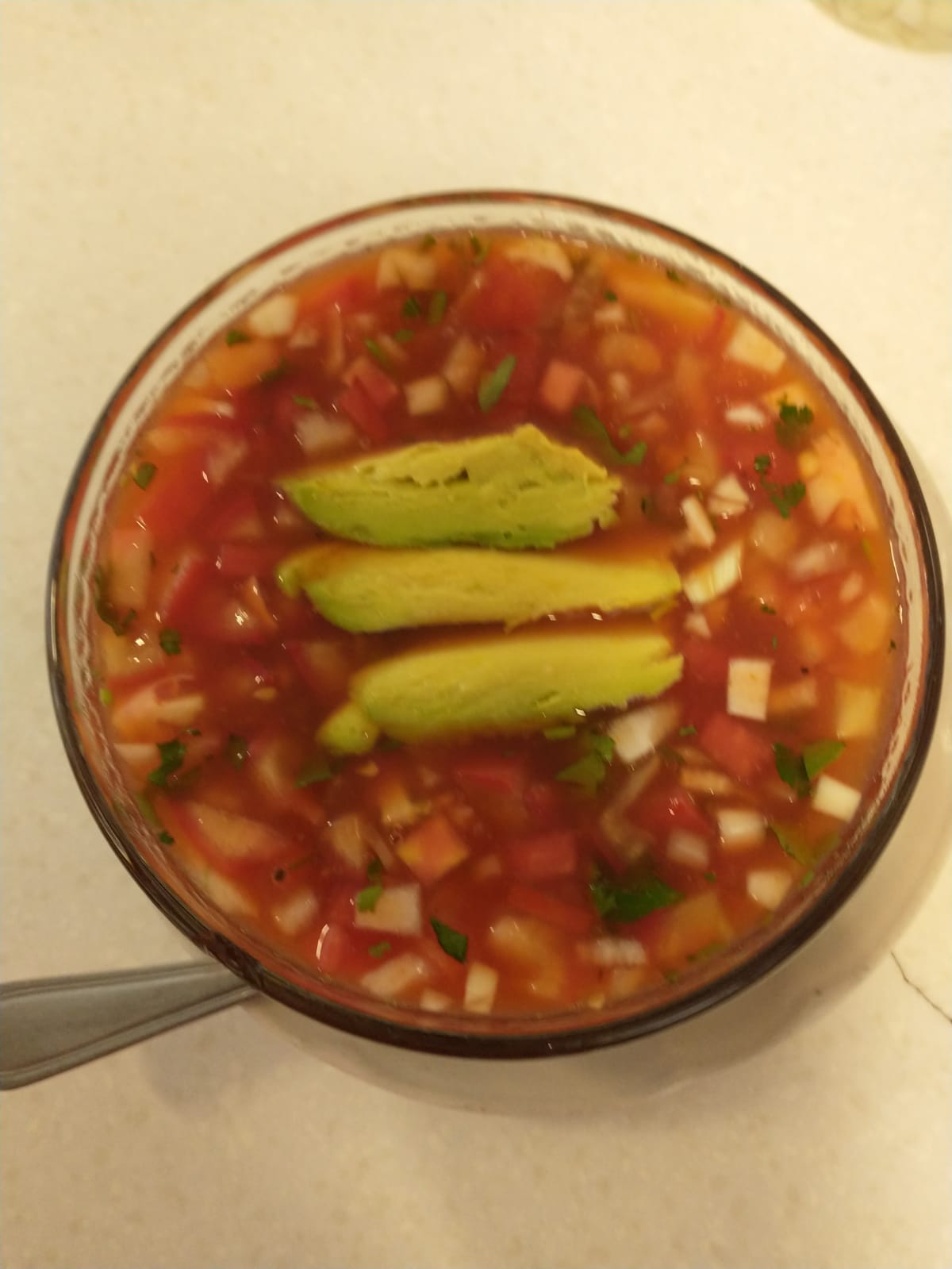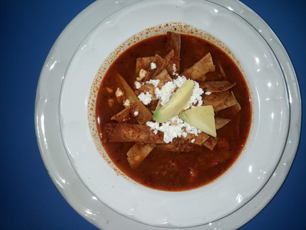 Caldo rojo con migas de tortilla, guajillo, aguacate, queso y contiene alrededor de un litro.