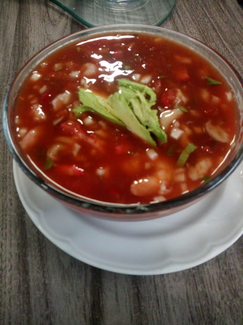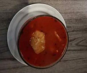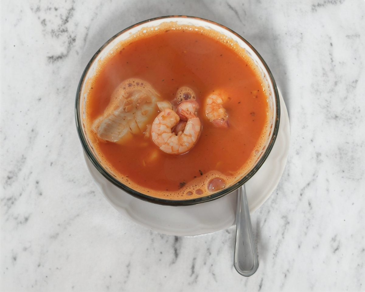 Caldo rojo con camarón, mejillón, pulpo al menas, pescado y contiene un litro.