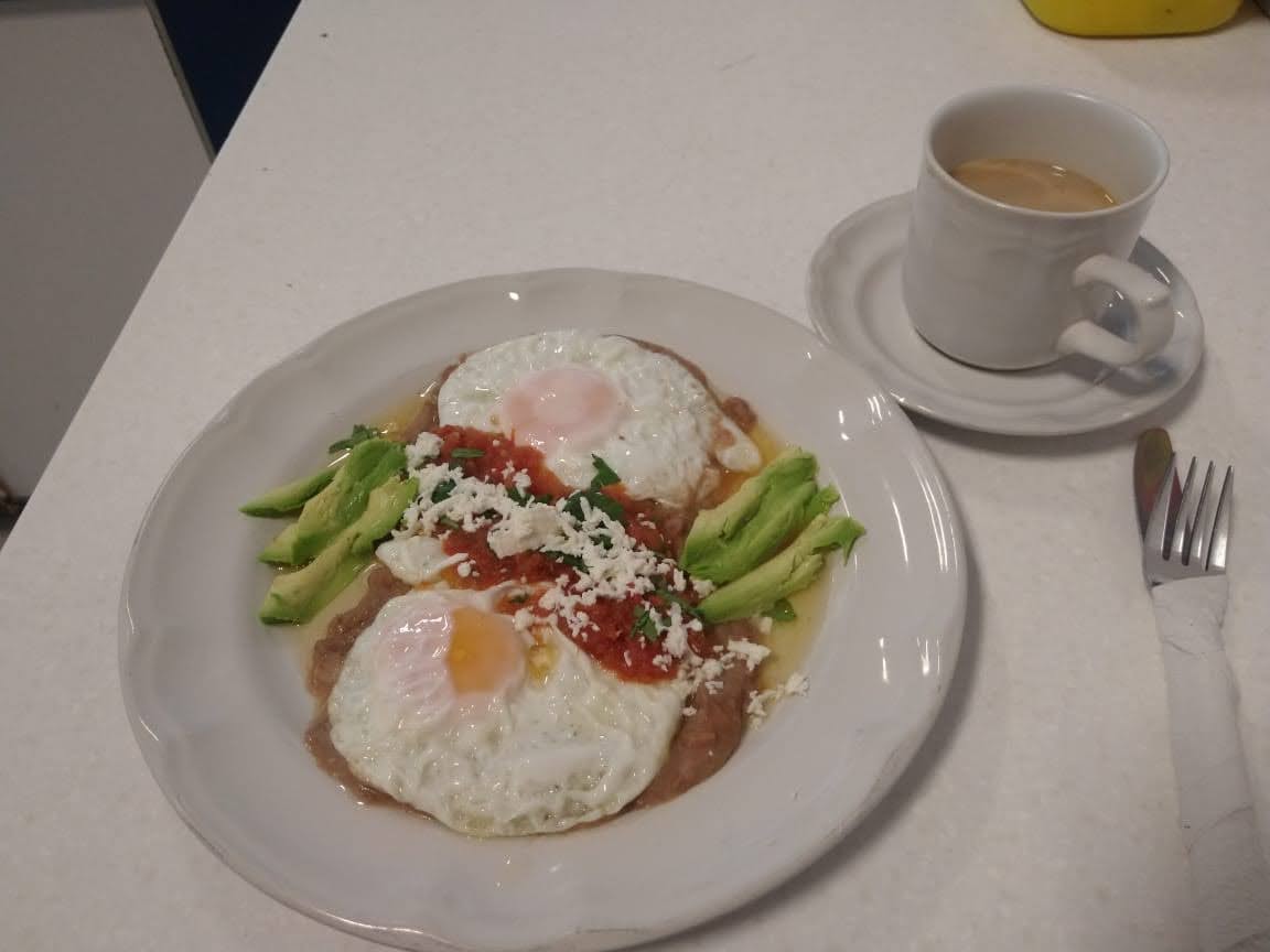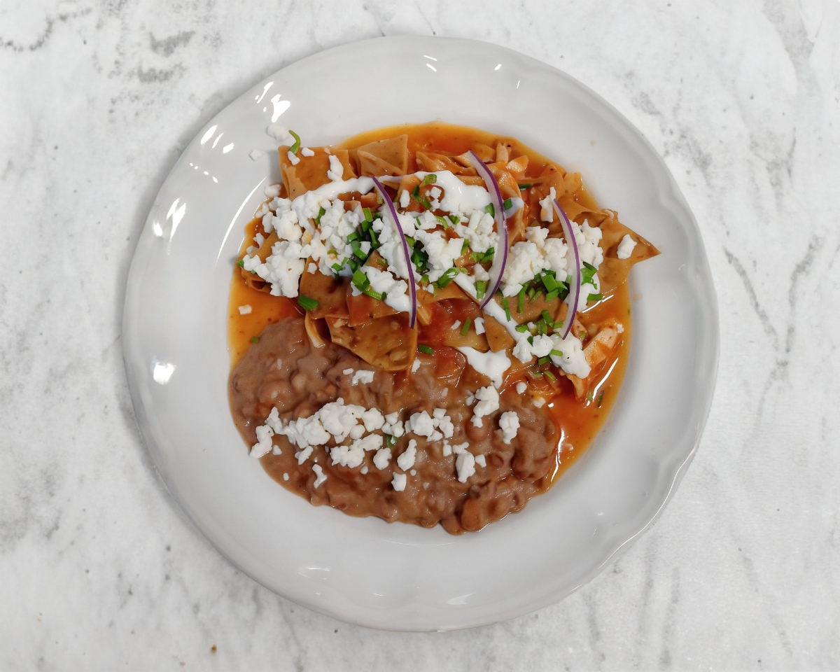 Chilaquiles con huevo estrellado o revuelto o con queso acompañados con un bolillo y su bebida.