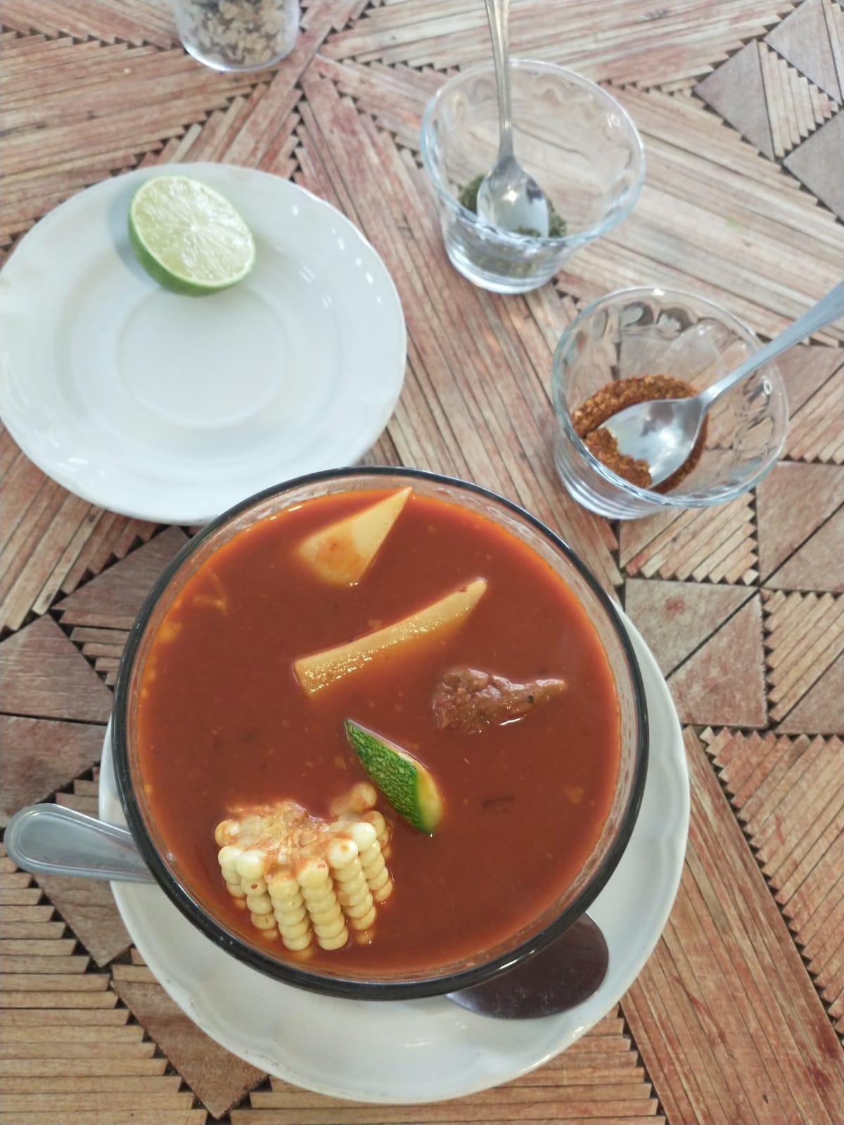 Caldo rojo acompañado con tortilla orégano chile de árbol de arroz y sus verduras y contiene alrededor de un litro.