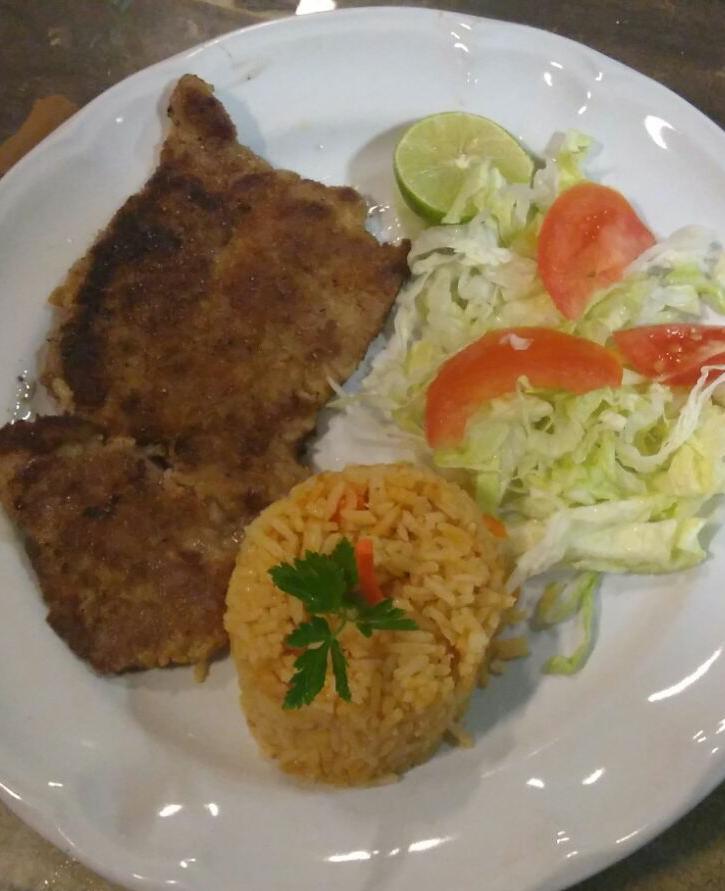 Sus acompañantes arroz y ensalada de lechuga.