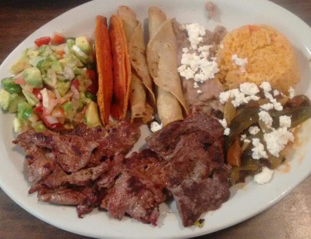 Filete de res acompañada con dos piezas de flautas además lleva arroz frijoles salsa tortillas y rajas.