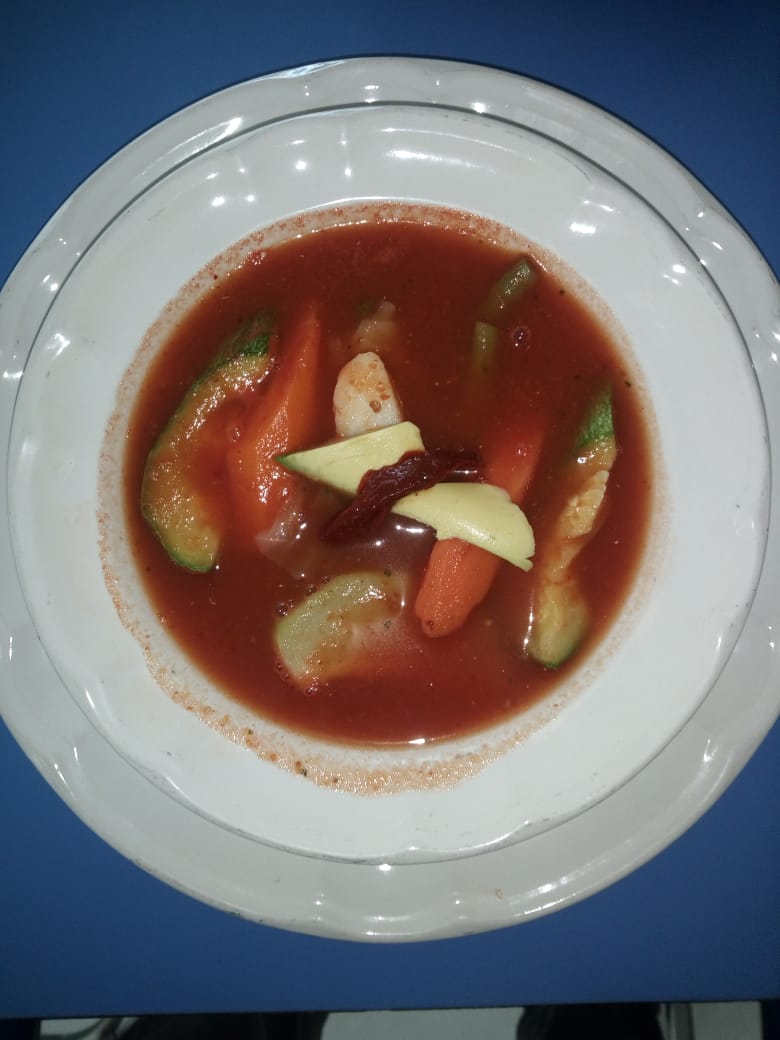 Caldo rojo con verduras y filete de pescado va acompañado con un bolillo, su salsa y contiene alrededor de un litro.