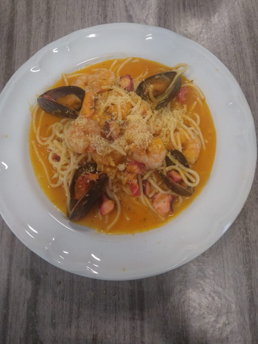 En salsa de tomate con mejillón, almeja, camarón, pulpo y queso parmesano.